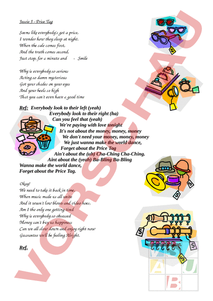 Jessie Price Tag Seems like everybody got price, wonder how they sleep at night. When the sale comes first, And the truth comes second, Just stop, for minute and Smile Why is everybody so serious Acting so damn mysterious Got your shades on your eyes And your heels so high That you cant even have good time Ref: Everybody look to their left (yeah) Everybody look to their right (ha) Can you feel that (yeah) Were paying with love tonight It not about the money, money, money We dont need your money, money, money We just wanna make the world dance, Forget about the Price Tag Aint about the (uh) Cha-Ching Cha-Ching. Aint about the (yeah) Ba-Bling Ba-Bling Wanna make the world dance, Forget about the Price Tag. Okay! We need to take it back in time, When music made us all unite And it wasnt low blows and video hoes, Am the only one getting tired Why is everybody so obsessed Money cant buy us happiness Can we all slow down and enjoy right now Guarantee well be feeling Alright. Ref.