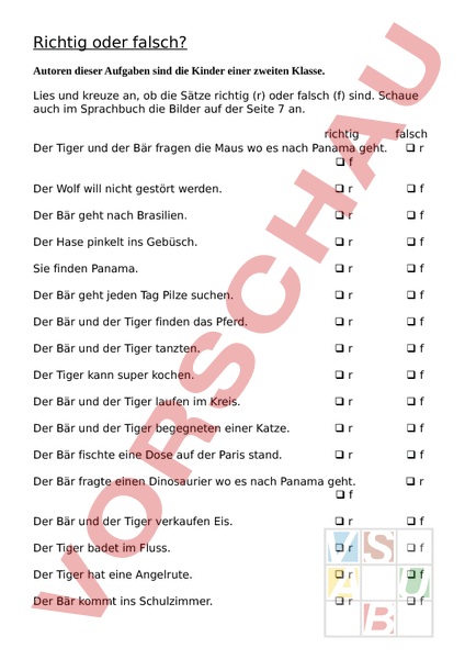 Richtig oder falsch? Autoren dieser Aufgaben sind die Kinder einer zweiten Klasse. Lies und kreuze an, ob die Sätze richtig (r) oder falsch (f) sind. Schaue auch im Sprachbuch die Bilder auf der Seite 7 an. richtig falsch Der Tiger und der Bär fragen die Maus wo es nach Panama geht. r f Der Wolf will nicht gestört werden. r f Der Bär geht nach Brasilien. r f Der Hase pinkelt ins Gebüsch. r f Sie finden Panama. r f Der Bär geht jeden Tag Pilze suchen. r f Der Bär und der Tiger finden das Pferd. r f Der Bär und der Tiger tanzten. r f Der Tiger kann super kochen. r f Der Bär und der Tiger laufen im Kreis. r f Der Bär und der Tiger begegneten einer Katze. r f Der Bär fischte eine Dose auf der Paris stand. r f Der Bär fragte einen Dinosaurier wo es nach Panama geht. f r Der Bär und der Tiger verkaufen Eis. r f Der Tiger badet im Fluss. r f Der Tiger hat eine Angelrute. r f Der Bär kommt ins Schulzimmer. r f Der Bär hat eine Brille. r f