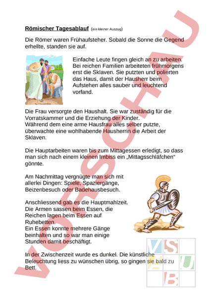 Römischer Tagesablauf (ein kleiner Auszug) Die Römer waren Frühaufsteher. Sobald die Sonne die Gegend erhellte, standen sie auf. Einfache Leute fingen gleich an zu arbeiten. Bei reichen Familien arbeiteten frühmorgens erst die Sklaven. Sie putzten und polierten das Haus, damit der Hausherr beim Aufstehen alles sauber und leuchtend vorfand. Die Frau versorgte den Haushalt. Sie war zuständig für die Vorratskammer und die Erziehung der Kinder. Während dem eine arme Hausfrau alles selber putzte, überwachte eine wohlhabende Hausherrin die Arbeit der Sklaven. Die Hauptarbeiten waren bis zum Mittagessen erledigt, so dass man sich nach einem kleinen Imbiss ein „Mittagsschläfchen gönnte. Am Nachmittag vergnügte man sich mit allerlei Dingen: Spiele, Spaziergänge, Beizenbesuch oder Badehausbesuch. Anschliessend gab es die Hauptmahlzeit. Die Armen sassen beim Essen, die Reichen lagen beim Essen auf Ruhebetten. Ein Essen konnte mehrere Gänge beinhalten und so war man einige Stunden damit beschäftigt. In der Zwischenzeit wurde es dunkel. Die künstliche Beleuchtung liess zu wünschen übrig, so gingen sie bald zu Bett. Hier noch ein kurzes Gespräch beim Essen: Livia schrie: Julius! Wo hast du dich versteckt? Es gibt Essen./! Julius kommt angerannt und sagt: Ich war mit anderen Kindern spielen. Was gibt es zu essen? Livia antwortet: Du wirst schon sehen, was es zu essen gibt.