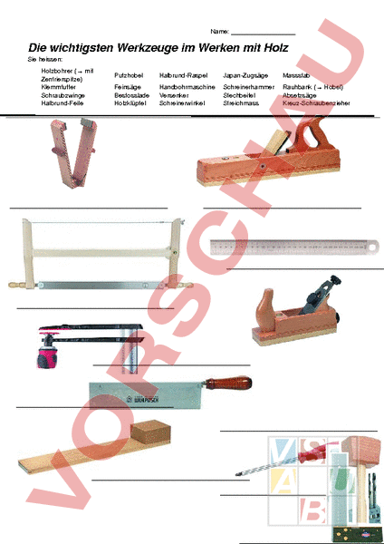 Name: Die wichtigsten Werkzeuge im Werken mit Holz Sie heissen: Holzbohrer ( mit Zentrierspitze) Klemmfutter Schraubzwinge HalbrundFeile Putzhobel HalbrundRaspel JapanZugsäge Massstab Feinsäge Bestosslade Holzklüpfel Handbohrmaschine Versenker Schreinerwinkel Schreinerhammer Stechbeitel Streichmass Rauhbank ( Hobel) Absetzsäge KreuzSchraubenzieher Schreibe zu jedem Werkzeug den entsprechenden Namen. Diese Werkzeuge kennst Du von jetzt an!