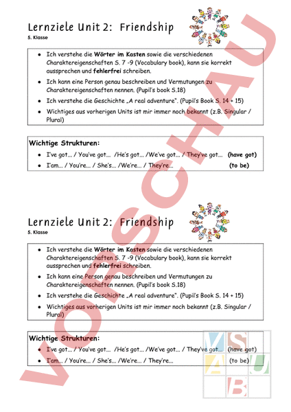 Ler nz iele nit 2: Fr iendship 5. Klasse Ich verstehe die Wörter im Kasten sowie die verschiedenen Charaktereigenschaften S. 7 -9 (Vocabulary book), kann sie korrekt aussprechen und fehlerfrei schreiben. Ich kann eine Person genau beschreiben und Vermutungen zu Charaktereigenschaften nennen. (Pupils book S.18) Ich verstehe die Geschichte „A real adventure. (Pupils Book S. 14 15) Wichtiges aus vorherigen Units ist mir immer noch bekannt (z.B. Singular Plural) Wichtige Strukturen: Ive got. Youve got. /Hes got. /Weve got. Theyve got. (have got) Iam. Youre. Shes. /Were. Theyre. (to be) Ler nz iele nit 2: Fr iendship 5. Klasse Ich verstehe die Wörter im Kasten sowie die verschiedenen Charaktereigenschaften S. 7 -9 (Vocabulary book), kann sie korrekt aussprechen und fehlerfrei schreiben. Ich kann eine Person genau beschreiben und Vermutungen zu Charaktereigenschaften nennen. (Pupils book S.18) Ich verstehe die Geschichte „A real adventure. (Pupils Book S. 14 15) Wichtiges aus vorherigen Units ist mir immer noch bekannt (z.B. Singular Plural) Wichtige Strukturen: Ive got. Youve got. /Hes got. /Weve got. Theyve got. (have got) Iam. Youre. Shes. /Were. Theyre. (to be)
