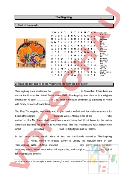 Thanksgiving 1. Find all the words. 2. Read the text and fill in the missing words from the box below. Thanksgiving is celebrated on the in November. It has been an annual tradition in the United States since 1863. Thanksgiving was historically religious observation to give to God. Most Americans celebrate by gathering at home with family or friends for holiday. The First Thanksgiving was celebrated to give thanks to God and the Native Americans for helping the pilgrims the brutal winter. Although half of the who arrived on the Mayflower died, many more would have had if not been for the native Americans teaching the pilgrims to harvest foods. The first Thanksgiving feast lasted three whole providing food for 53 pilgrims and 90 Indians. In the United States, certain kinds of food are traditionally served at Thanksgiving . Firstly, baked or roasted turkey is usually the featured item on any Thanksgiving table. Stuffing, mashed with gravy, sweet potatoes, cranberry sauce, sweet corn, other fall vegetables, and pumpkin are typical for Thanksgiving dinners. patatoes – feast – thanks – pie – meals – enough – fourth – survive – Thursday – days – pilgrims 3 Label these pictures with word from the text! 4. Find the correct translation to these words. annual since gathering (to gather) feast pilgrims although to harvest lasted providing (to provide) gravy Festessen seit Pilger Einwanderer jährlich obwohl dauerte sich versammeln versorgen Bratensauce ernten