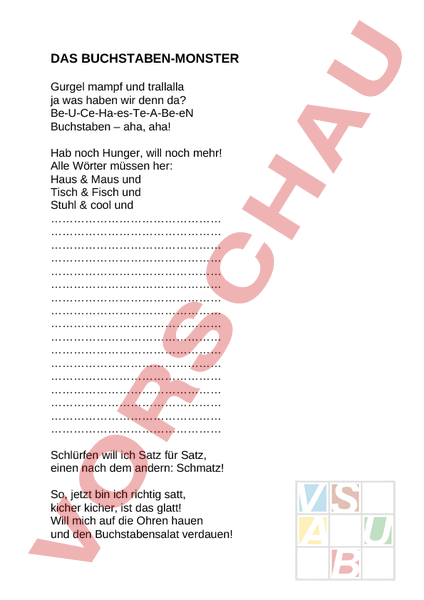 DAS BUCHSTABEN-MONSTER Gurgel mampf und trallalla ja was haben wir denn da? Be-U-Ce-Ha-es-Te-A-Be-eN Buchstaben – aha, aha! Hab noch Hunger, will noch mehr! Alle Wörter müssen her: Haus Maus und Tisch Fisch und Stuhl cool und Schlürfen will ich Satz für Satz, einen nach dem andern: Schmatz! So, jetzt bin ich richtig satt, kicher kicher, ist das glatt! Will mich auf die Ohren hauen und den Buchstabensalat verdauen!