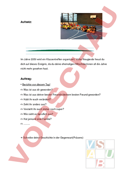 Aufsatz: Im Jahre 2050 wird ein Klassentreffen organisiert. Voller Neugierde freust du dich auf dieses Ereignis, da du deine ehemaligen MitschülerInnen all die Jahre nicht mehr gesehen hast. Auftrag: • Berichte von diesem Tag! Was ist aus dir geworden? Was ist aus deiner besten Freundin/deinem besten Freund geworden? Habt ihr euch verändert? Seht ihr anders aus? Versteht ihr euch immer noch super? Wie sieht es beruflich aus? Hat jemand eine Familie? Schreibe deine Geschichte in der Gegenwart(Präsens) 4 Beurteilungsblatt zum Aufsatz: Klassentreffen 3 1. In deiner Geschichte sind SpannungsAufbau und Höhepunkt erkennbar.(Einleitung, Hauptteil, Schluss Du hast das Interesse des Lesers damit geweckt. 2. Du hast keine Gedankensprünge gemacht, so dass man die Geschichte gut versteht. 3. Du hast dich in die Personen hineinversetzt und auch Gefühle und Gedanken ausgedrückt. So wird die Geschichte lebendig. 4. Du hast treffende Verben gefunden. Du hast treffende Adjektive gefunden. 5. Du hast unnötige Wiederholungen vermieden, so dass die Erzählung nicht langweilig wird. Die Satzanfänge sind abwechslungsreich und die 6. Sätze sind nicht gleichförmig (Umstellung). Du hast die direkte Rede gut eingebaut. Die Zeichensetzung stimmt. 7. Du hast die Satzzeichen richtig gesetzt. 8. Die Erzählzeit stimmt. (Präsens) 9. Du hast keine Fehler gemacht, die du selber vermeiden könntest. Du arbeitest mit dem Wörterbuch. 10. Du hast eine saubere Darstellung. Der Text ist in Abschnitte aufgeteilt. Du hast schön geschrieben. Name: Bemerkungen: Punkte: 35/ Note: Ø: 2 1