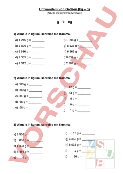 Arbeitsblatt: umwandlung gewicht kg g
