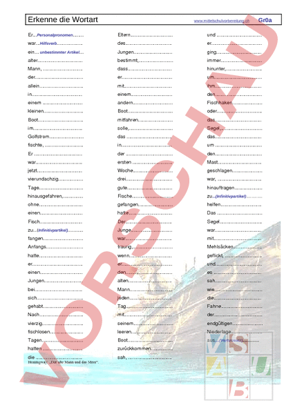 Erkenne die Wortart www.mittelschulvorbereitung.ch Gr0a Er.Personalpronomen Eltern. und war.Hilfsverb. des. er ein. unbestimmter Artikel. Jungen. ging alter bestimmt,. immer. Mann, dass. hinunter,. der. er um allein mit ihm. in einem. den. einem andern. Fischhaken kleinen. Boot. oder. Boot. mitfahren das. im. solle, Segel, Golfstrom. das das. fischte, in um . Er der den. war. ersten Mast. jetzt Woche. geschlagen vierundachzig drei. war, . Tage gute hinauftragen. hinausgefahren,. Fische zu.(Infinitivpartikel). ohne. gefangen helfen. einen hatte. Das . Fisch Der. Segel. zu.(Infinitivpartikel). Junge. war. fangen war. mit Anfangs. traurig,. Mehlsäcken. hatte. wenn geflickt, . er er und. einen den. es Jungen. alten. sah. bei Mann wie. sich jeden die gehabt Tag Fahne Nach mit der. vierzig seinem. endgültigen fischlosen. leeren. Niederlage. Tagen Boot. aus(Verbzusatz). hatten zurückkommen die . sah, . Hemingway: „Der alte Mann und das Meer.