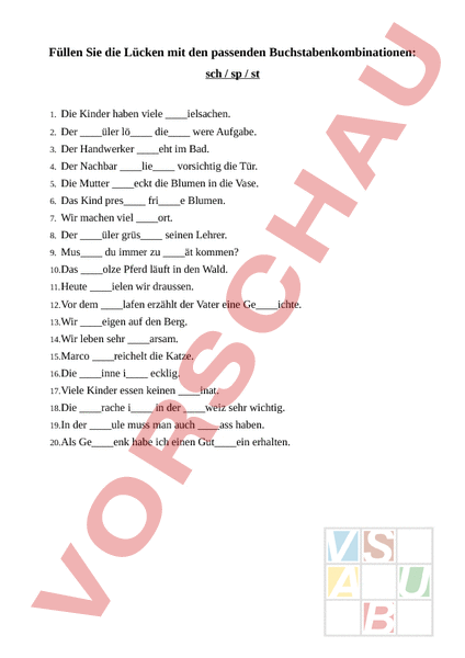 Füllen Sie die Lücken mit den passenden Buchstabenkombinationen: sch sp st 1. Die Kinder haben viele ielsachen. 2. Der üler lö die were Aufgabe. 3. Der Handwerker eht im Bad. 4. Der Nachbar lie vorsichtig die Tür. 5. Die Mutter eckt die Blumen in die Vase. 6. Das Kind pres frie Blumen. 7. Wir machen viel ort. 8. Der üler grüs seinen Lehrer. 9. Mus du immer zu ät kommen? 10. Das olze Pferd läuft in den Wald. 11. Heute ielen wir draussen. 12. Vor dem lafen erzählt der Vater eine Geichte. 13. Wir eigen auf den Berg. 14. Wir leben sehr arsam. 15. Marco 16. Die inne i ecklig. 17. Viele 18. Die 19. In reichelt die Katze. Kinder essen keinen inat. rache i in der weiz sehr wichtig. der ule muss man auch ass haben. 20. Als Geenk habe ich einen Gutein erhalten.
