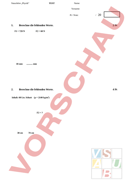 Naturlehre „Physik TEST Name: Vorname: Pt Note: 1. Berechne die fehlenden Werte. F1 720 18 mm 2. 20 2 Pt F2 60 . mm Berechne die fehlenden Werte. Inhalt: 60 Ltr. Schutt ( 2140 kg/m3) F2 ? 30 cm 70 cm 4 Pt 3. Berechne die fehlenden Werte. 5 Pt 4. Berechne die fehlenden Werte. 4 Pt Bestimme: 2 M1 . Nm 3 . 5. Eine Person mit dem Körpergewicht von 65 kg betätigt die Pedale. Berechne die resultierende Kraft F2 6. Zwei Personen tragen eine Kiste mit einer Gewichtskraft von 500 N. Beide tragen je eine Hälfte. Kreuze die richtige Antwort an. Sind F1 und F2 betragen je 250 Sind F1 und F2 betragen je 125 Sind F1 und F2 betragen je 325 3 45 3 Pt 45 2Pt