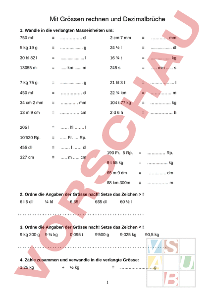 Arbeitsblatt: Grössen umwandeln und Dezimalzahlen