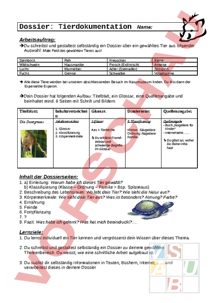 Dossier: Tierdokumentation Name: Arbeitsauftrag: Du schreibst und gestaltest selbständig ein Dossier über ein gewähltes Tier aus folgender Auswahl: Male Feld des gewählten Tieres aus! Steinbock Wildschwein Luchs Fuchs Reh Hausmarder Murmeltier Gemse Kreuzotter Frosch (Erdfrosch) Adler (Steinadler) Schwalbe Biene Ameise Skorpion Vogelspinne Alle diese Tiere werden bei unserem abschliessenden Besuch im Naturmuseum finden. Du bist dann der Experte/die Expertin. Dein Dossier hat folgenden Aufbau: Titelblatt, ein Glossar, eine Quellenangabe und beinhaltet mind. 6 Seiten mit Schrift und Bildern. Titelblatt: Inhaltsverzeichni Glossar. s: Dossierseite: Quellenangabe: Die Zwergmaus Inhaltsverzeichnis 1.Glossar 2. Klassefizierung Quellenangabe 1. Glossar 2. Klassifizierung 3. Körpermerkmale Aas Tierleiche Klasse: Säugetiere Ordnung: Nagetiere Familie: Ä Du erklärst FremdWörter und schwierige Begriffe im Glossar Buch „Nagetiere für Kinder Internetseite Ä Du gibst an, woher Du deine Infos hast Inhalt der Dossierseiten: 1. a) Einleitung: Warum habe ich dieses Tier gewählt? b) Klassifizierung (Klasse – Ordnung – Familie Bsp. Spitzmaus) 2. Beschreibung des Lebensraum: Wo lebt dein Tier? Wie sieht die Natur aus? 3. Körpermerkmale: Wie sieht dein Tier aus? Was ist besonders? Atmung? Farbe? 4. Ernährung 5. Feinde 6. Fortpflanzung 7. 8. Fazit: Was habe ich gelernt? Was hat mich beeindruckt? Lernziele: 1. Du lernst individuell ein Tier kennen und vergrösserst dein Wissen über dieses Thema. 2. Du schreibst und gestaltest selbständig ein Dossier zu deinem gewählten Themenbereich. Du weisst, wie eine schriftliche Arbeit aufgebaut ist. 3. Du suchst dir selbständig Informationen in Texten, Büchern, Internet, und verarbeitest dieses in deinem Dossier Dossier: Tierdokumentation M&U Name: --------------------------Kriterien----------------------Kriterien Du hast selb ständig Information n zu deine Tier gefund n. Du hast wichtige Information n aus e ä hlt und zusa m n e a st Du hast Texte mit eig n n Worten verfas st und nicht nur abg s h ri b n Der Inhalt deine Dos si er ist vollständig. Du hast den Inhalt sinnvoll und über si htlich ge glie e rt. Du hast Bilder sinnvoll eing s tzt. Dein Dossi er ist anspr c e d ge c ri b n und ge staltet. Be e rkun e n: Note: Untersc hrift: