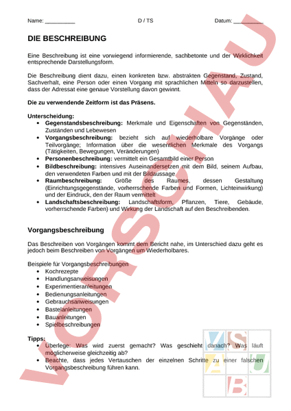 Name: / TS Datum: DIE BESCHREIBUNG Eine Beschreibung ist eine vorwiegend informierende, sachbetonte und der Wirklichkeit entsprechende Darstellungsform. Die Beschreibung dient dazu, einen konkreten bzw. abstrakten Gegenstand, Zustand, Sachverhalt, eine Person oder einen Vorgang mit sprachlichen Mitteln so darzustellen, dass der Adressat eine genaue Vorstellung davon gewinnt. Die zu verwendende Zeitform ist das Präsens. Unterscheidung: • Gegenstandsbeschreibung: Merkmale und Eigenschaften von Gegenständen, Zuständen und Lebewesen • Vorgangsbeschreibung: bezieht sich auf wiederholbare Vorgänge oder Teilvorgänge; Information über die wesentlichen Merkmale des Vorgangs (Tätigkeiten, Bewegungen, Veränderungen) • Personenbeschreibung: vermittelt ein Gesamtbild einer Person • Bildbeschreibung: intensives Auseinandersetzen mit dem Bild, seinem Aufbau, den verwendeten Farben und mit der Bildaussage • Raumbeschreibung: Größe des Raumes, dessen Gestaltung (Einrichtungsgegenstände, vorherrschende Farben und Formen, Lichteinwirkung) und der Eindruck, den der Raum vermittelt • Landschaftsbeschreibung: Landschaftsform, Pflanzen, Tiere, Gebäude, vorherrschende Farben) und Wirkung der Landschaft auf den Beschreibenden. Vorgangsbeschreibung Das Beschreiben von Vorgängen kommt dem Bericht nahe, im Unterschied dazu geht es jedoch beim Beschreiben von Vorgängen um Wiederholbares. Beispiele für Vorgangsbeschreibungen • Kochrezepte • Handlungsanweisungen • Experimentieranleitungen • Bedienungsanleitungen • Gebrauchsanweisungen • Bastelanleitungen • Bauanleitungen • Spielbeschreibungen Tipps: • Überlege: Was wird zuerst gemacht? Was geschieht danach? Was läuft möglicherweise gleichzeitig ab? • Beachte, dass jedes Vertauschen der einzelnen Schritte zu einer falschen Vorgangsbeschreibung führen kann. • • • • • • • • • • • • • • Denke an den Leser, der die einzelnen Schritte nachvollziehen können muss. Begründe, wenn möglich, die einzelnen Handlungsschritte. Die Sprache ist sachlich. Die Fachwörter müssen den Vorgang bzw. Sachverhalt genau treffen. Formuliere die Sätze kurz und klar und passe den Stil dem Vorgang an. Verwende Formulierungen wie „Nachdem ., „Im Anschluss an . Die Ausdrucksweise ist unpersönlich, nicht „Ich mache . oder „Er verwendet ., besser: „Man nehme . Oft ist es sinnvoll, Nominalisierungen (der Nominalstil ist durch die Häufung von Substantiven gekennzeichnet) zu verwenden. Wecke in einer Einleitung das Interesse des Lesers für die Beschreibung Gib in einem Schluss ergänzende Tipps Einleitung und Schluss dürfen nicht zu lang sein Schreibe sachlich (keine Gefühle oder persönlichen Eindrücke), genau (mithilfe von Adverbien, Attributen) und verständlich (keine komplizierten Schachtelsätze). Vermeide Wortwiederholungen! Oftmals wird im Passiv geschrieben. Verknüpfung der Vorgangsschritte mit Verbindungswörtern: danach, anschliessend, während, als nächstes, . Noch einmal: Im Präsens schreiben! Aufgabe: Jan hat zum Geburtstag einen Bürostuhl bekommen. Die Anleitung zum Aufbauen ist schrittweise in Bildern beschrieben. Jan findet, dass die Anleitung besser zu verstehen sei, wenn sie eine Vorgangsbeschreibung enthielte. Erledige du das!
