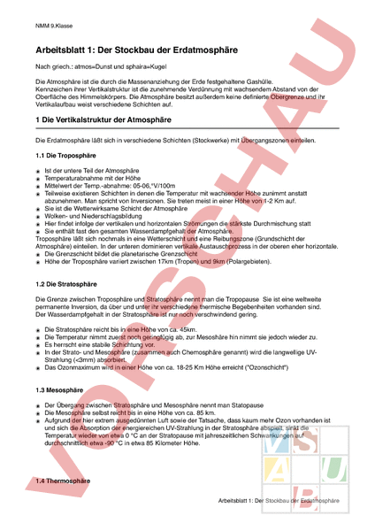 NMM 9.Klasse! Arbeitsblatt 1: Der Stockbau der Erdatmosphäre Nach griech.: atmosDunst und sphairaKugel Die Atmosphäre ist die durch die Massenanziehung der Erde festgehaltene Gashülle. Kennzeichen ihrer Vertikalstruktur ist die zunehmende Verdünnung mit wachsendem Abstand von der Oberfläche des Himmelskörpers. Die Atmosphäre besitzt außerdem keine definierte Obergrenze und ihr Vertikalaufbau weist verschiedene Schichten auf. 1 Die Vertikalstruktur der Atmosphäre Die Erdatmosphäre läßt sich in verschiedene Schichten (Stockwerke) mit Übergangszonen einteilen. 1.1 Die Troposphäre ๏ ๏ ๏ ๏ Ist der untere Teil der Atmosphäre Temperaturabnahme mit der Höhe Mittelwert der Temp.-abnahme: 05-06,V/100m Teilweise existieren Schichten in denen die Temperatur mit wachsender Höhe zunimmt anstatt abzunehmen. Man spricht von Inversionen. Sie treten meist in einer Höhe von 1-2 Km auf. ๏ Sie ist die Wetterwirksame Schicht der Atmosphäre ๏ Wolken- und Niederschlagsbildung ๏ Hier findet infolge der vertikalen und horizontalen Strömungen die stärkste Durchmischung statt ๏ Sie enthält fast den gesamten Wasserdampfgehalt der Atmosphäre. Troposphäre läßt sich nochmals in eine Wetterschicht und eine Reibungszone (Grundschicht der Atmosphäre) einteilen. In der unteren dominieren vertikale Austauschprozess in der oberen eher horizontale. ๏ Die Grenzschicht bildet die planetarische Grenzschicht ๏ Höhe der Troposphäre variiert zwischen 17km (Tropen) und 9km (Polargebieten). 1.2 Die Stratosphäre Die Grenze zwischen Troposphäre und Stratosphäre nennt man die Tropopause Sie ist eine weltweite permanente Inversion, da über und unter ihr verschiedene thermische Begebenheiten vorhanden sind. Der Wasserdampfgehalt in der Stratosphäre ist nur noch verschwindend gering. ๏ ๏ ๏ ๏ Die Stratosphäre reicht bis in eine Höhe von ca. 45km. Die Temperatur nimmt zuerst noch geringfügig ab, zur Mesoshäre hin nimmt sie jedoch wieder zu. Es herrscht eine stabile Schichtung vor. In der Strato- und Mesosphäre (zusammen auch Chemosphäre genannt) wird die langwellige UVStrahlung (