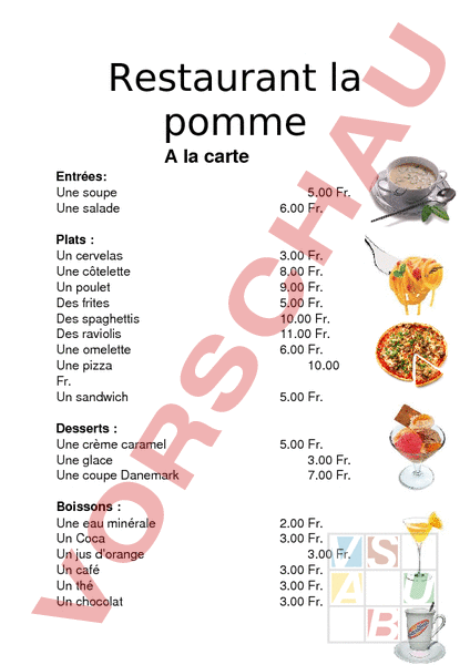 Restaurant la pomme Entrées: Une soupe Une salade la carte Plats Un cervelas Une côtelette Un poulet Des frites Des spaghettis Des raviolis Une omelette Une pizza Fr. Un sandwich 5.00 Fr. 6.00 Fr. 3.00 Fr. 8.00 Fr. 9.00 Fr. 5.00 Fr. 10.00 Fr. 11.00 Fr. 6.00 Fr. 10.00 5.00 Fr. Desserts Une crème caramel Une glace Une coupe Danemark 5.00 Fr. 3.00 Fr. 7.00 Fr. Boissons Une eau minérale Un Coca Un jus dorange Un café Un thé Un chocolat 2.00 Fr. 3.00 Fr. 3.00 Fr. 3.00 Fr. 3.00 Fr. 3.00 Fr. Une ovomaltine 3.00 Fr.