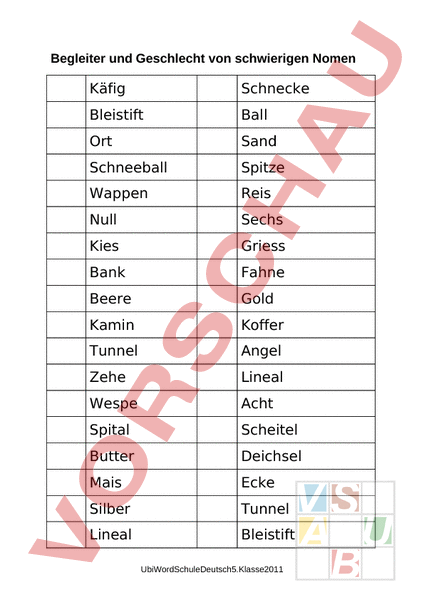 Begleiter und Geschlecht von schwierigen Nomen Käfig Schnecke Bleistift Ball Ort Sand Schneeball Spitze Wappen Reis Null Sechs Kies Griess Bank Fahne Beere Gold Kamin Koffer Tunnel Angel Zehe Lineal Wespe Acht Spital Scheitel Butter Deichsel Mais Ecke Silber Tunnel Lineal Bleistift UbiWordSchuleDeutsch5.Klasse2011 Begleiter und Geschlecht von schwierigen Nomen der Käfig die Schnecke der Bleistift der Ball der Ort der Sand der Schneeball die Spitze das Wappen der Reis die Null die Sechs der Kies der Griess die Bank die Fahne die Beere das Gold der Kamin der Koffer der Tunnel die Angel die Zehe das Lineal die Wespe die Acht das Spital der Scheitel die Butter die Deichsel der Mais die Ecke das Silber der Tunnel das Lineal der Bleistift UbiWordSchuleDeutsch5.Klasse2011
