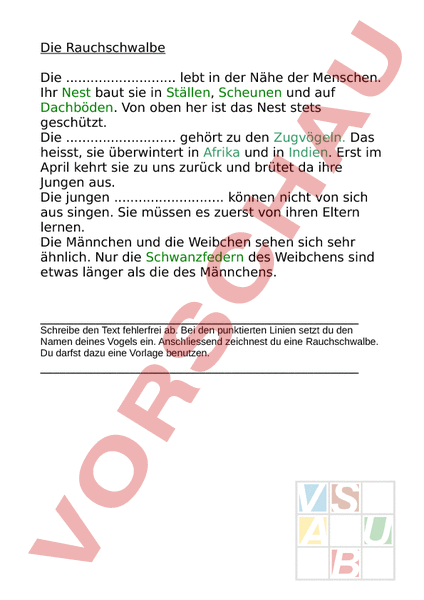 Die Rauchschwalbe Die . lebt in der Nähe der Menschen. Ihr Nest baut sie in Ställen, Scheunen und auf Dachböden. Von oben her ist das Nest stets geschützt. Die . gehört zu den Zugvögeln. Das heisst, sie überwintert in Afrika und in Indien. Erst im April kehrt sie zu uns zurück und brütet da ihre Jungen aus. Die jungen . können nicht von sich aus singen. Sie müssen es zuerst von ihren Eltern lernen. Die Männchen und die Weibchen sehen sich sehr ähnlich. Nur die Schwanzfedern des Weibchens sind etwas länger als die des Männchens. Schreibe den Text fehlerfrei ab. Bei den punktierten Linien setzt du den Namen deines Vogels ein. Anschliessend zeichnest du eine Rauchschwalbe. Du darfst dazu eine Vorlage benutzen.