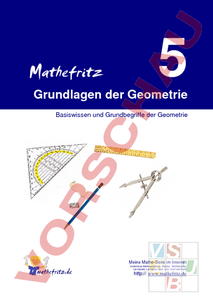 Skript und Aufgabensammlung Grundlagen der Geometrie Mathefritz 5 Grundlagen der Geometrie Basiswissen und Grundbegriffe der Geometrie Meine Mathe-Seite im Internet kostenlose Matheaufgaben, Skripte, Mathebücher Lernspiele, Lerntipps, Quiz und noch viel mehr http:// www.mathefritz.de Seite 1 Skript und Aufgabensammlung Grundlagen der Geometrie Copyright 2008 Mathefritz.de Alle Rechte vorbehalten. Vervielfältigung nur zu eigenen Zwecken sowie zum Einsatz im Unterricht erlaubt. Eine Bitte Sollten Sie in diesem Skript Fehler finden, so senden Sie bitte eine e-Mail an Wir sind bemüht, diese so schnell wie möglich zu korrigieren. Im Internet finden Sie immer die aktuellste Version. Noch geplant: • Weitere Themen • Lösungen zu allen Aufgaben • Fortsetzung: allgemeines Bruchrechnen, Addieren, Subtrahieren, Multiplizieren und Dividieren von Brüchen Diese Version Versionsnummer: 0.01.01 Versionsdatum: 24.05.2008 Seite 2 Skript und Aufgabensammlung Grundlagen der Geometrie Inhaltsverzeichnis 1. Unser Handwerkszeug 4 2. Grundlegende Begriffe . 4 3. 2.1 Koordinatensystem 4 2.2 Punkte im Koordinatensystem Koordinaten eines Punktes . 5 2.3 Strecke . 6 2.4 Gerade 6 2.5 Strahl 7 2.6 Parallel und Senkrecht . 7 2.7 Konstruktion der Parallelen durch einen Punkt mit Geodreieck und Lineal 9 2.8 Konstruktion der Senkrechten durch einen Punkt 10 2.9 Der Abstand von parallelen Geraden . 11 Aufgaben zu den bisherigen Grundlagen . 12 3.1 Aufgabe 1: Punkte und Koordinatensystem. 12 3.2 Aufgabe 2: Strecken, Abstände und Geraden 12 3.3 Aufgabe 3: Parallel und Senkrecht. 12 Seite 3 Skript und Aufgabensammlung Grundlagen der Geometrie Unser Handwerkszeug Bevor wir richtig loslegen, benötigen wir einige Hilfsmittel für unsere Arbeit: 1. 2. 3. 4. 5. 6. Bleistift Radiergummi Lineal Geodreieck Zirkel ein Rechenheft Achte darauf, dass der Bleistift immer gespitzt ist. Zeichne sauber in dein Heft. Grundlegende Begriffe Koordinatensystem Ein Koordinatensystem ist für uns das Bezugssystem zum Zeichnen von Punkten und anderen geometrischen Objekten. Ein Koordinatensystem besteht aus: 2 Achsen, der waagrechten x-Achse und der senkrechten y-Achse einer Skalenteilung auf der x- und der y-Achse. Diese Skalenteilung wird normalerweise im Heft alle 2 Kästchen eingezeichnet! dem Ursprung (Nullpunkt), das ist der Schnittpunkt der x- und der y-Achse. Merke: An das rechte Ende der x-Achse sowie an das obere Ende der y-Achse zeichnen wir einen kleinen Pfeil. Betrachte hierzu das abgebildete Koordinatensystem. Seite 4 Skript und Aufgabensammlung Grundlagen der Geometrie Punkte im Koordinatensystem Koordinaten eines Punktes Punkte geben einen genauen Ort in einem Koordinatensystem an, ähnlich wie auf einer Landkarte. Jeder Punkt wird mit einem großen Buchstaben angegeben. In dem Koordinatensystem unten sind dies die Punkte und Q. Jeder Punkt ist eindeutig durch eine x-Koordinate und eine y-Koordinate bestimmt. P(2/3) bedeutet: Gehe auf der x-Achse 2 Schritte in positiver Richtung (nach rechts) und dann 3 Schritte senkrecht hierzu in die positive yRichtung (nach oben). Q(-2/1) bedeutet: Gehe auf der x-Achse 2 Schritte in negativer Richtung (nach links) und dann 1 Schritt senkrecht hierzu in positive y-Richtung (nach oben). Beispiel und Übung Bestimme die Koordinaten der folgenden Punkte im Koordinatensystem: Q S U ( ( ( / / / ) ) ) Seite 5 Skript und Aufgabensammlung Grundlagen der Geometrie Strecke Eine gerade Linie zwischen zwei Punkten heißt Strecke. Aufgabe: Zeichne in das nebenstehende Koordinatensystem die Punkte P(2/1) und Q(4/3) Verbinde die Punkte und Q. Wir erhalten die Strecke PQ Merke: Eine Strecke kennzeichnen wir, indem wir Anfangs- und Endpunkt zusammen schreiben, versehen mit einem Strich über den beiden Buchstaben! Aufgabe: Miss die Länge der Strecke PQ mit einem Lineal. Die Länge einer Strecke PQ heißt auch Entfernung oder Abstand der Punkte und Q. Die Länge der Strecke wird mit PQ bezeichnet. Gerade Eine Gerade ist eine gerade Linie ohne Anfangs und Endpunkt. Geraden werden mit kleinen Buchstaben bezeichnet. Trotzdem können wir eine Gerade immer nur mit einer bestimmten Länge einzeichnen, da unser Platz begrenzt ist. Merke: Durch zwei verschiedene Punkte gibt es immer nur genau eine Gerade! Aufgabe: Zeichne die Punkte (-2/-2) und Q(3/3) in das nebenstehende Koordinatensystem und zeichne die Gerade g, die durch beide Punkte verläuft. Bestimme den Schnittpunkt der Geraden mit der bereits eingezeichneten Geraden h. Seite 6 Skript und Aufgabensammlung Grundlagen der Geometrie Strahl Ein Strahl ist eine gerade Linie mit einem genauen Anfangspunkt aber ohne Endpunkt. Du kannst dir den geometrischen Begriff „Strahl genauso wie den Strahl einer Taschenlampe oder eines Lasers vorstellen. Es gibt die Lichtquelle, dies ist der Anfangspunkt. Der Strahl verläuft dann vom Anfangspunkt unendlich gerade weiter. Ein Strahl wird durch einen Anfangspunkt sowie einen weiteren Punkt genau beschrieben. Aufgabe: Bestimme den Anfangspunkt sowie einen weiteren Punkt der auf dem Strahl liegt. Anfangspunkt: Weiterer Punkt: ( ( / ) Parallel und Senkrecht Für die Konstruktion von senkrechten und parallelen Linien benötigen wir unser Geodreieck: Wichtig: Grundlinie und Mittellinie eines Geodreiecks sind zueinander senkrecht! Seite 7 Skript und Aufgabensammlung Grundlagen der Geometrie Grundkonstruktion einer Senkrechten Wir zeichnen eine Senkrechte zu einer Geraden h, indem wir zunächst die Mittellinie des Geodreiecks auf die Gerade legen. Jetzt zeichnen wir entlang der Grundlinie des Geodreiecks die Gerade g. Diese ist nun senkrecht zu der Geraden h. Grundkonstruktion einer Parallelen Wir legen das Geodreieck so an, dass eine Hilfslinie auf der Geraden liegt. Nun zeichnen wir entlang der Grundlinie des Geodreiecks die Gerade h. Diese ist parallel zur Geraden g. Aufgabe: Zeichne eine Parallele zur Gerade und eine Senkrechte zur Geraden h. Seite 8 Skript und Aufgabensammlung Grundlagen der Geometrie Konstruktion der P