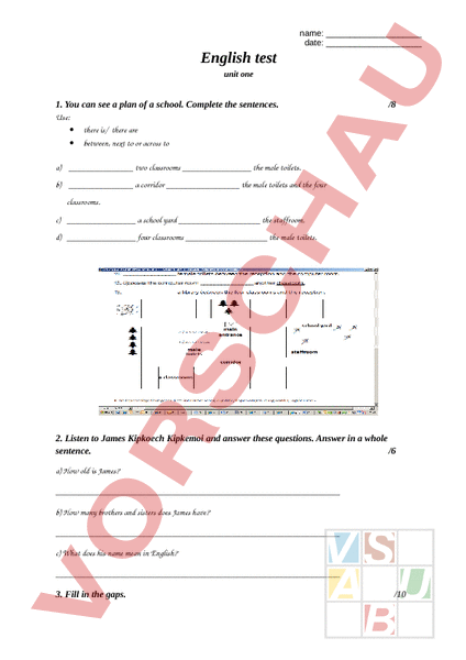 name: date: English test unit one 1. You can see plan of school. Complete the sentences. Use: • • /8 there is/ there are between, next to or across to a) two classrooms the male toilets. b) corridor the male toilets and the four classrooms. c) school yard the staffroom. d) four classrooms the male toilets. 2. Listen to James Kipkoech Kipkemoi and answer these questions. Answer in whole sentence. /6 a) How old is James? b) How many brothers and sisters does James have? c) What does his name mean in English? 3. Fill in the gaps. /10 Full form Person name: date: Short form am Im 2. Person Plural 3. Person Plural 1. Pers. Singular 2. Pers. Singular 3. Pers. Singular 1. Person Plural 4. Fill in the plural forms a) There were two (lady) walking around the house. b) The (child) are watching TV. c) have two (leg). d) Do you like (strawberry)? /10 name: date: e) dont like (sandwich). f) There are two (apple) on the desk. g) New York is one of the most fascinating (city) in the world. h) How many (sister) do you have? i) (man) come from Mars. j) My (foot) hurt from walking. Points: of 34