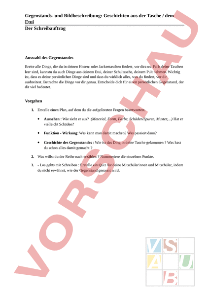 Gegenstands- und Bildbeschreibung: Geschichten aus der Tasche dem Etui Der Schreibauftrag Auswahl des Gegenstandes Breite alle Dinge, die du in deinen Hosen- oder Jackentaschen findest, vor dira us. Falls deine Taschen leer sind, kannstu du auch Dinge aus deinem Etui, deiner Schultasche, deinem Pult nehmen. Wichtig ist, dass es deine persönlichen Dinge sind und dass du wirklich alles, was du findest, vor dir ausbreitest. Betrachte die Dinge vor dir genau. Entscheide dich für einen persönlichen Gegenstand, der dir viel bedeutet. Vorgehen 1. Erstelle einen Plan, auf dem du die aufgelisteten Fragen beantwortest. • Aussehen Wie sieht er aus? (Material, Form, Farbe, Schäden/Spuren, Muster,) Hat er vielleicht Schäden? • Funktion Wirkung: Was kann man damit machen? Was passiert dann? • Geschichte des Gegenstandes Wie ist das Ding in deine Tasche gekommen Was hast du schon alles damit gemacht 2. Was willst du der Reihe nach erzählen Nummeriere die einzelnen Punkte. 3. Los gehts mit Schreiben Erstelle ein Quiz für deine Mitschülerinnen und Mitschüler, indem du nicht erwähnst, wie der Gegenstand genannt wird. Gegenstands- und Bildbeschreibung: Geschichten aus der Tasche dem Etui Ein Beispielstext zum Vorlesen im Unterricht Die drei kleinen . aus meinem Etui In meinem roten Blechetui von Caran dAche habe ich drei kleine, quaderförmige Dinge gefunden. Sie sind so klein, dass eine Kantenlänge lediglich fünf Millimeter ausma. Daher passen sie sehr gut in das niedliche Etui. Sie sind aus Plastik. Nebst den schwarzen Augen sind sie nahezu weiss. Das stimmt zwar so nicht ganz. Denn das Weiss ist durch die Bleistiftminen im Etui etwas gräulich. Das wirkt etwas dreckig. Diese kleinen Dinge braucht man in der Regel zum Spielen. Schüttelt man sie gut in der Hand oder im Becher, wirft sie nachher auf eine glatte Fläche, so kullern sie lustig über den Tisch, bis sie schliesslich zum Stillstand kommen. Das ermöglicht dem Spieler, die nach oben gerichteten Punkte abzulesen. Diese reichen von der Eins bis zur Sechs. Jede Seitenfläche des Gegenstandes ist mit solchen Punkten ausgestattet. In den meisten Spielen bedeutet die Sechs etwas Gutes und die Eins das Gegenteil. Es sei denn, man spiele Yahtzee. Da wirft der Spieler fünf dieser Dinge auf den Tisch. Was bei Yahtzee zählt, ist die Komposition der Punkte, die auf den jeweiligen Seitenflächen erscheinen. Diese drei kaum sichtbaren Dinge habe ich in der Tat einem Yahtzee-Set abgeknüpft. Ich brauchte sie nämlich, um mit meinen Nachhilfeschülern das Konjugieren von Französischverben zu üben. Oft hatten wir jede Menge Spass damit. Die Personalpronomen sind– im Deutsch und in der französischen Sprache – genau sechs. Wenn man „je für die Eins, „tu für die Zwei benutzt, kann man in dieser Art jeder Zahl eine Person zuordnen. So bleibt für die dritte Person im Plural, „ils, die Zahl sechs übrig. Danach muss man lediglich ein Verb finden, dessen Konjugation man üben möchte und los gehts! So haben diese kleinen Wichte aus meinem Etui schon oft leben in langweilige Französischstunden gebracht. Wenn ich mich langweile, benutze ich sie auch als Zeitvertrieb mit meinen Freunden. Gerade während langen Zugfahrten kann man irgendwelche Spiele erfinden. Man braucht dazu ja nur etwas Erfindergeist, einen bis drei der Gegenstände, sowie Zettel und Schreiber für den Punktestand. Na, weisst du, wovon ich spreche? (300 Wörter Gegenstands- und Bildbeschreibung: Geschichten aus der Tasche dem Etui Strukturierungshilfefür chülerinnen und chüler Geschichten aus der Tasche Anbei findest du eine Vorlage, wie dein Text in etwa aussehen sollte. Die einzelnen Punkte zeigen dir, wie der Text hier strukturiert wurde. Natürlich brauchst du diese Punkte in dem Text nicht zu erwähnen. Es sollte ein Fliesstext sein und aus 250 – 300 Wörtern bestehen! Titel: Die drei kleinen . aus meinem Etui 1. Aussehen (Material, Form, Farbe, Schäden/Spuren, Muster,) In meinem roten Blechetui von Caran dAche habe ich drei kleine, quaderförmige Dinge gefunden. Sie sind so klein, dass eine Kantenlänge lediglich fünf Millimeter ausmacht. Daher passen sie sehr gut in das niedliche Etui. Sie sind aus Plastik. Nebst den schwarzen Augen sind sie nahezu weiss. Das stimmt zwar so nicht ganz. Denn das Weiss ist durch die Bleistiftminen im Etui etwas gräulich. Das wirkt etwas dreckig. 2. Funktion Wirkung: Was man damit machen kann -.: Was dann passiert Diese kleinen Dinge braucht man in der Regel zum Spielen. Schüttelt man sie gut in der Hand oder im Becher, wirft sie nachher auf eine glatte Fläche, so kullern sie lustig über den Tisch, bis sie schliesslich zum Stillstand kommen. Das ermöglicht dem Spieler, die nach oben gerichteten Punkte abzulesen. Diese reichen von der Eins bis zur Sechs. Jede Seitenfläche des Gegenstandes ist mit solchen Punkten ausgestattet. In den meisten Spielen bedeutet die Sechs etwas Gutes und die Eins das Gegenteil. Es sei denn, man spiele Yahtzee. Da wirft der Spieler fünf dieser Dinge auf den Tisch. Was bei Yahtzee zählt, ist die Komposition der Punkte, die auf den jeweiligen Seitenflächen erscheinen. 3. Geschichte des Gegenstandes (Weg in die Tasche/ins Etui, Was ich damit schon angestellt habe: Diese drei kaum sichtbaren Dinge habe ich in der Tat einem Yahtzee-Set abgeknüpft. Ich brauchte sie nämlich, um mit meinen Nachhilfeschülern das Konjugieren von Französischverben zu üben. Oft hatten wir jede Menge Spass damit. Die Personalpronomen sind– im Deutsch und in der französischen Sprache – genau sechs. Wenn man „je für die Eins, „tu für die Zwei benutzt, kann man in dieser Art jeder Zahl eine Person zuordnen. So bleibt für die dritte Person im Plural, „ils, die Zahl sechs übrig. Danach muss man lediglich ein Verb finden, dessen Konjugation man üben möchte und los gehts! So haben diese kleinen Wichte aus meinem Etui schon oft leben in langweilige Französischstunden gebracht. Wenn ich mich langweile,