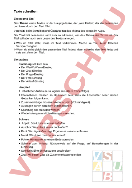 Texte schreiben Thema und Titel Das Thema eines Textes ist der Hauptgedanke, der „rote Faden, der die Leserinnen und Leser durch den Text führt. Behalte beim Schreiben und Überarbeiten das Thema des Textes im Auge. Der Titel hilft Leserinnen und Leser zu erkennen, was das Thema des Textes ist. Der Titel soll aber auch zum Lesen des Textes anregen. Was im Titel steht, muss im Text vorkommen. Mache im Titel keine falschen Versprechungen! Wenn du nicht gleich den passenden Titel findest, dann schreibe den Text fertig und setz erst dann den Titel. Textaufbau Einleitung soll kurz sein • Der WerWoWann-Einstieg • Der Zitat-Einstieg • Der Frage-Einstieg • Der Foto-Einstieg • Der Anlauf-Einstieg Hauptteil • Inhaltlicher Aufbau muss logisch sein (klare Reihenfolge). • Informationen müssen so strukturiert sein, dass die Leserin/der Leser deinen • • • • Gedanken folgen kann. Zusammenhänge müssen erkennbar sein (Vollständigkeit). Aussagen dürfen sich nicht widersprechen. Spannung soll erzeugen werden. Wiederholungen und Überflüssiges streichen. Schluss • Appell: Den Leser zu etwas aufrufen • • • • • Ausblick: Was bleibt immer noch offen? Fazit: Wichtigstes/wichtige Ergebnisse zusammenfassen Moral: Was kann man daraus lernen? Pointe: Höhepunkt zu einem Ende abrunden Schleife zum Anfang: Rückverweis auf die Frage, auf Bemerkungen in der Einleitung • Szenisch: Eine Schlussszene beschreiben • Zitat: Mit einem Zitat als Zusammenfassung enden Du kannst nun Woche für Woche, ohne Zeitdruck, am Schreiben arbeiten. Die folgenden drei Aufträge sollen dir dabei helfen, Ideen zu entwickeln, den Aufbau einer Geschichte sinnvoll zu gestalten und die Überarbeitung zu trainieren. Versuch bei jedem einzelnen Text das Gelernte anzuwenden. Du darfst ruhig auch Sachen ausprobieren, die du vorher noch nie gemacht hast. Vielleicht entstehen daraus ganz gute Geschichten! Halte dich beim Schreiben an folgende Schritte: 1. Ideen zum Thema sammeln (Cluster) 2. Ideen sortieren 3. Titel auswählen, der zum Thema passt (den Titel kannst du auch nach dem Schreiben deines Textes anpassen) 4. Einleitung 5. Hauptteil 6. Schluss 7. Überarbeitung Meine Merkliste: Die Lehrperson steht dir bei Schwierigkeiten immer zur Verfügung. Sofern du einen Text beendet hast, kannst du ihn ihr zum Lesen geben. Beim Schreiben deiner Geschichten wünsche ich dir viel Vergnügen, gutes Gelingen und eine Menge Fantasie! Auftrag 1: Kleine Geschichten schreiben Schreibe nach dem Prinzip der beiden Muster eine oder zwei kleine Geschichten. Diese brauchen nicht tiefgründig zu sein, dafür vielleicht lustig und ausgefallen. Charly reitet links, Johnny rechts vom Boss Bill über die Prärie. Oh Charly, sag mal, wie viel gibt drei mal drei? Wie viel das gibt, Boss? Schätze neun. Boss Billy zieht den Colt, ein Schuss und Charly macht einen Salto vom Pferd. Oh Boss, das hast du absichtlich getan, heult Johnny. Yes, Johnny, hab ich. Der Kerl wusste zu viel. Beide sind schon arg lädiert. Ob Kinnhaken-Karl diesmal durchhält? Zum X-ten Mal kriegt er eine Gerade auf seine krumme Nase. Er blutet und die Zuschauer toben. Der Ringrichter kann kein Blut sehen und geht zu Boden. Falls du keine Idee für ein Wort hast, stehen dir hier einige Vorschläge zur Auswahl: Rosenstrauss, Simsalabim, Sauwetter, Marsmenschen, Roboter, Nordpol, Papagei, Sparschwein, Eigengoal, Lokomotive, Liebesbrief, Flipperkasten, Affenzahn, Hot Dog Auftrag 2: Reizwörter-Geschichte BUCH BRIEF TELEFON PLASTIK SCHLOSS WURST FLUSS Schreibe aus den obenstehenden Wörtern eine spannende, lustige, fantasievolle, skurrile, ernsthafte oder humorvolle Geschichte. Vergiss dabei den Titel nicht. Auftrag 3: Freier Text Wähle selbstständig ein Thema und einen Titel aus und verfasse dazu eine Geschichte. Setze dabei um, was du gelernt hast. Vergiss nicht deinen Text zu überarbeiten.