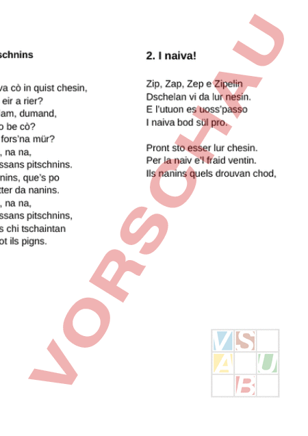 1. Pitschnins 2. naiva! Chi viva cò in quist chesin, Odast eir rier? Eau clam, dumand, Chi sto be cò? Est tü forsna mür? Na na, na na, Nus essans pitschnins. Pitschnins, ques po be tratter da nanins. Na na, na na, Nus essans pitschnins, Nanins chi tschaintan Cô suot ils pigns. Zip, Zap, Zep Zipelin Dschelan vi da lur nesin. lutuon es uosspasso naiva bod sül pro. Pront sto esser lur chesin. Per la naiv el fraid ventin. Ils nanins quels drouvan chod, Inviern es uossa bainbod.3. Eau udur la naiv Eau udur la naiv Juhu, juhe! Eau dhe grand Gust ed oz mieu pè! Eau vegn per laina Aint il god! La chesa vögl s-chuder Cha es bel chod! 4. Naiv 5. Tuorta buna 6. Cher San Niclo Naiv cuverna il god Dals nanins. Sbischa naiva hoz Dün cuntin. Il Zip ed il Zipelin faun Ün hom da glatsch, Cun üna rischmelna Ed ün grand butatsch! Tuorta buna, tuorta fina, que fo zip hoz saira. Tuorta buna, tuorta mmh, Nos Zip sto cò ria! Chau tü cher vegl San Niclo. Ve tschainta giò. Ve, baiva ün cafè prouva eir Mieus buns bisquits. Ve, baiva ün cafè prouva Mieus bisquits. Tuorta buna, tuorta fina, Tuot es plain farina! Tuorta buna, tuorta mmh, chi regalel üna? 7. Pip, pip utschelin ingrazch per tieu tschüvler.8. Chi? eir nus!9. Pachific Pip, pip utschelin Ve no tar me. Eau port bgers buns graunins cò per te. La naiv cuverna tuot in alv, Üngün graun da chatter. Eau dun gugent, Chi ho be, chi ho be? Aint il god, aint il god? Ho in praseppan, in praseppan, miss aint fain, miss aint fain? Ad es pachific Da ster cun vus. Anun es lungurus. Bgeras parevlas da nanins, so quinter uschè bain il Zepelin. Bgeras parevlas da nanins, so quinter uschè bain il Zepelin. Eau se chi, eau se chi! Ils nanins, ils nanins! Ed els perchüran, els perchüran, eir nus, 10. Chi picha? 11. Pum tac-tac pum! 12. Gibeli, gibeli, giò Chi picha, picha, picha, picha, vi da la fnestra? Chi picha, picha, picha, Picha que es il Zepelin! Cu-cu Zip, Vainst ün pò dadour? Cu-cu Zip, Ad ho do bgera naiv. Cu-cu Zip, Schmetta da fer tuortas! Cu-cu Zip, cun la naiv vulains giuver! Pum tac-tac pum! Pum tac-tac pum! Tirli- tirli- tirli- tittra damaun es cuorsa da la schlitta! Gibeli, gibeli, giò. Dal muot nus rudlains in giò. zieva in sü che stantus. Hei, cun chatschin giò! Pum tac-tac pum! Pum tac-tac pum! Tirli- tirli- tirli- telt minchün voul esser il pü svelt! 13. Che es be que? 14. Che fo Zep? Che es be que, üngün nu po vzair? Es que strivlo es que be nair? Na, na, na que sun bels chavaglins! Il Zip fo quels cun sieus maunins. Na, na, na que sun bels chavaglins! Il Zip fo quels cun sieus maunins! Il Zep es tuot sulet, el fo ün bel paquet. El ho ün fil sto svelt cusir. Che es be que, üngün nu po vzair? Es que ün pom es que ün pair? Na, na, na que sun bels chavaglins! Il Zip fo quels cun sieus maunins. Na, na, na que sun bels chavaglins! Il Zip fo quels cun sieus maunins! Pst, pst tü nu poust tradir.15. Schnip-schnap Schnip-schnap, schnip-schnap schnip-schnap, schnign. Las pü bellas stailas fo nos Zipelin. Uossa fol na posa, sieu daint es tuot iflo, da tuot quellas stailas chal ho fin uosstaglio. je, je, il daint quel fo fich mel. je, je, il daint quel fo fich mel. 16. Mmh 17. Sömmi dal nanin che insömgiast tü?18. Not Mmh, che savur taunt fina? Mmh, ad es forsda farina. Ils bisquits da Zap sun uossin fuornin, al prüm prouval svessa güst ün! Ils bisquits da Zap sun uossin fuornin, al prüm prouval svessa güst ün! Sömmi dal nanin. Sömmi dal nanin. Nanins insömgian adüna, Glüna cucca sur il god flöchins crouda giô dl ot. Stailas glüschan vi dal tschêl. bod es Nadel. 19. Be tschinch nots! lura es Nadel!20. Cu lainsa fer? Juhu, juhe be 5 nots durmir, eau mallegr uschè! Ün, duos, trais, quatter tschinch nots durmir, Cu lainsa, cu lainsa, chi ho già ünideja? Cu lainsa, cu lainsa, fer festa da Nadel? Cu lainsa, cu lainsa, chi ho già ünideja? Cu lainsa, cu lainsa, fer festa da Nadel? Il Zap voul ün bös-chin da Nadel. Il Zip voul chanter chandailas impizzer. Il Zep voul manger qualchosa fich bun ed il Zipelin voul ir our il bel godin. Cu lainsa, cu lainsa, chi ho già ünideja? Cu lainsa, cu lainsa, fer festa da Nadel?21. Marsch dal bös-chin aint il god tscherchainsa ün bös-chin. tres la naiv ans maina nos passin. La leivrina davaunt nus la disch taunt cher: Ün grand bel bös-chin chattais vi lo, vi lo. 22. Juhui, nus vains ün böschin lura es Nadel!23. Sül bös-chin bellas stailas uossas vezza stailas da pertuot.24. Nadel Juhui, nus vains ün bös-chin, perque essans fich cuntaints. Stuvais be pü duas nots durmir Sül bös-chin bellas stailas pend. Que fetsch eau minchan gugent. Bod el darcho cò quel bel temp fich prüvo, Chandailas glüschan, stailas splenduran, ils nanins rian, sallegran fich ferm. Tschaintan insembel, daun regalins. Els sun cuntaints, chad es uossNadel.