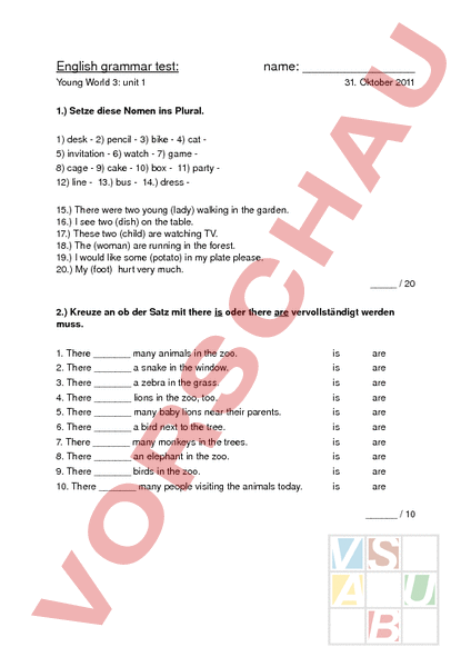 English grammar test: name: Young World 3: unit 1 31. Oktober 2011 1.) Setze diese Nomen ins Plural. 1) desk 2) pencil 3) bike 4) cat 5) invitation 6) watch 7) game 8) cage 9) cake 10) box 11) party 12) line 13.) bus 14.) dress 15.) There were two young (lady) walking in the garden. 16.) see two (dish) on the table. 17.) These two (child) are watching TV. 18.) The (woman) are running in the forest. 19.) would like some (potato) in my plate please. 20.) My (foot) hurt very much. 20 2.) Kreuze an ob der Satz mit there is oder there are vervollständigt werden muss. 1. There many animals in the zoo. is are 2. There snake in the window. is are 3. There zebra in the grass. is are 4. There lions in the zoo, too. is are 5. There many baby lions near their parents. is are 6. There bird next to the tree. is are 7. There many monkeys in the trees. is are 8. There an elephant in the zoo. is are 9. There birds in the zoo. is are 10. There many people visiting the animals today. is are 10 3.). Schreibe die langen Formen des Verbs to be auf. 1. Im climbing. 2. She isnt painting. 3. Theyre not playing 4. Were having fun. 5. Theyre shopping. 6. He falling. 7. Im not lying. 8. He not speaking. 9. Youre studying. 10. You arent watching TV. 10 Schreibe die Kurzform des Verbs to be auf. 11. You are not eating. 12. You are talking. 13. am reading. 14. We are jumping. 15. They are not working. 16. It is raining. 17. am not joking. 18. He is running. 19. She is not singing. 20. They are writing. 10 Bonus: Finde diejenigen Wörter, die wie cheese tönen. Kreuze sie an. kiss like sit ocean Jim feet eat swim miss tea sheep fit team screen jeep kid see leaf idea read pro richtige Antwort: Punkte: 6 47.5 5.75 45.6 5.5 43.7 5.25 41.8 5 40 4.75 38.1 4.5 36.2 4.25 34.3 Total Punkte:/ 50 Note: Meine eigene Note: 4 32.5 3.75 30.6 3.5 28.7 3.25 26.8 3 25 2.75 22.5 2.5 20 2.25 17.5