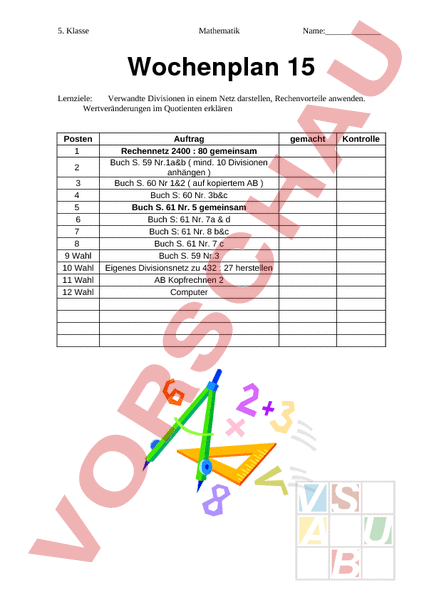 5. Klasse Mathematik Name:_ Wochenplan 15 Lernziele: Verwandte Divisionen in einem Netz darstellen, Rechenvorteile anwenden. Wertveränderungen im Quotienten erklären Posten 1 2 3 4 5 6 7 8 9 Wahl 10 Wahl 11 Wahl 12 Wahl Auftrag Rechennetz 2400 80 gemeinsam Buch S. 59 Nr.1a&b mind. 10 Divisionen anhängen Buch S. 60 Nr 1&2 auf kopiertem AB Buch S: 60 Nr. 3b&c Buch S. 61 Nr. 5 gemeinsam Buch S: 61 Nr. 7a d Buch S: 61 Nr. 8 b&c Buch S. 61 Nr. 7 Buch S. 59 Nr.3 Eigenes Divisionsnetz zu 432 27 herstellen AB Kopfrechnen 2 Computer gemacht Kontrolle