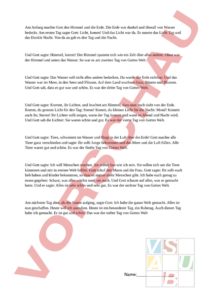 Am Anfang machte Gott den Himmel und die Erde. Die Erde war dunkel und überall von Wasser bedeckt. Am ersten Tag sagte Gott: Licht, komm! Und das Licht war da. Er nannte das Licht Tag und das Dunkle Nacht. Von da an gab es den Tag und die Nacht. Und Gott sagte: Himmel, komm! Der Himmel spannte sich wie ein Zelt über alles andere. Oben war der Himmel und unten das Wasser. So war es am zweiten Tag von Gottes Welt. Und Gott sagte: Das Wasser soll nicht alles andere bedecken. Da wurde die Erde sichtbar. Und das Wasser war im Meer, in den Seen und Flüssen. Auf dem Land wuchsen Gras, Bäume und Blumen. Und Gott sah, dass es gut war und schön. Es war der dritte Tag von Gottes Welt. Und Gott sagte: Kommt, ihr Lichter, und leuchtet am Himmel, dass man euch sieht von der Erde. Komm, du grosses Licht für den Tag: Sonne! Komm, du kleines Licht für die Nacht: Mond! Kommt auch ihr, Sterne! Ihr Lichter sollt zeigen, wann der Tag kommt und wann es Abend und Nacht wird. Und Gott sah die Lichter: Sie waren schön und gut. Es war der vierte Tag von Gottes Welt. Und Gott sagte: Tiere, schwimmt im Wasser und fliegt in der Luft über die Erde! Gott machte alle Tiere ganz verschieden und sagte: Ihr sollt Junge bekommen und das Meer und die Luft füllen. Alle Tiere waren gut und schön. Es war der fünfte Tag von Gottes Welt. Und Gott sagte: Ich will Menschen machen. Sie sollen fast wie ich sein. Sie sollen sich um die Tiere kümmern und mir in meiner Welt helfen. Gott schuf den Mann und die Frau. Gott sagte: Ihr sollt euch lieb haben und Kinder bekommen, so dass es immer mehr Menschen gibt. Ich habe euch genug zu essen gegeben: Schaut, was alles wächst rund um euch. Und Gott schaute auf alles, was er gemacht hatte. Und er sagte: Alles ist sehr schön und sehr gut. Es war der sechste Tag von Gottes Welt. Am nächsten Tag aber, als die Sonne aufging, sagte Gott: Ich habe die ganze Welt gemacht. Alles ist nun geschaffen. Heute will ich ausruhen. Heute ist ein besonderer Tag, ein Ruhetag. Auch diesen Tag habe ich gemacht. Er ist gut und schön. Das war der siebte Tag von Gottes Welt Name: Die Geschichte von den ersten sieben Tagen Diese Geschichte stammt von den Juden und den Christen Was machte Gott in dieser Geschichte an diesen Tagen: 1. Tag:_ 5. Tag: 2. Tag: 6. Tag: 3. Tag: 7.Tag: 4. Tag: