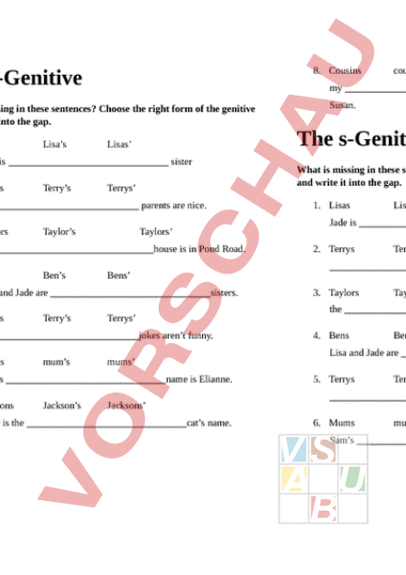 8. Cousins The s-Genitive Lisas Lisas Jade is sister 2. Terrys Terrys Terrys parents are nice. 3. Taylors Taylors Taylors the house is in Pond Road. 4. Bens Bens Bens Lisa and Jade are sisters. 5. Terrys Terrys Terrys jokes arent funny. 6. Mums mums mums Sams name is Elianne. 7. Jacksons Jacksons cousins my names are Phil, Tracy and What is missing in these sentences? Choose the right form of the genitive and write it into the gap. 1. Lisas cousins Jacksons Tiger is the cats name. Susan. The s-Genitive What is missing in these sentences? Choose the right form of the genitive and write it into the gap. 1. Lisas Lisas Lisas Jade is sister 2. Terrys Terrys Terrys parents are nice. 3. Taylors Taylors Taylors the house is in Pond Road. 4. Bens Bens Bens Lisa and Jade are sisters. 5. Terrys Terrys Terrys jokes arent funny. 6. Mums mums mums Sams name is Elianne. 7. Jacksons Jacksons Jacksons Tiger is the cats name. 8. Cousins cousins cousins my names are Phil, Tracy and Susan.