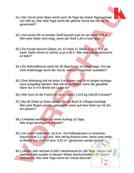 31.) Der Vorrat einer Ware reicht noch 36 Tage bei einem Tagesumsatz von 350 kg. Wie viele Tage reicht der gleiche Vorrat bei 280 kg Tagesumsatz? 32.) Von einem 80 cm breiten Stoff braucht man für ein Kleid 4,55 m. Wie viele Meter sind nötig, wenn der Stoff 1,40 breit liegt? 33.) Ein Kunde tauscht Gläser um. Er hatte 12 Stück zu je 0,75 € gekauft. Dafür nimmt er solche zu je 0,45 €. Wie viele Gläser bekommt er dafür? 34.) Ein Rohstoffvorrat reicht für 35 Maschinen 24 Arbeitstage. Für wie viele Arbeitstage reicht der Vorrat, wenn 7 Maschinen ausfallen? 35.) Eine Wohnung soll mit einer 3 breiten und 26 langen Auslegeware ausgelegt werden. Wie viel ist zu liefern, wenn die gewählte Ware nur in 4 Breite am Lager ist? 36.) Wie hoch ist die Fracht für 18,2 t, wenn 1.015 kg 108,95 € kosten? 37.) Bei 40 Zeilen je Seite werden für ein Buch 8 Bogen benötigt. Wie viele Bogen werden gebraucht, wenn auf eine Seite nur 34 Zeilen passen? 38.) 5 Arbeiter benötigen für einen Auftrag 16 Tage. Wie lange benötigen 8 Arbeiter? 39.) Um einen Fußboden, 18,9 m, mit Fußbodenlack zu streichen, braucht man 2,1 kg Lack. Wie viel kg braucht man, wenn zwei weitere Böden von 20,9 m bzw. 9,52 m gestrichen werden sollen? 40.) Letztes Jahr reichten 6.500 Heizölvorrat für 195 Tage. Wegen der starken Kälte wurden in diesem Winter durchschnittlich 40 täglich verbraucht. Wie viele Tage reicht der Vorrat diesmal?
