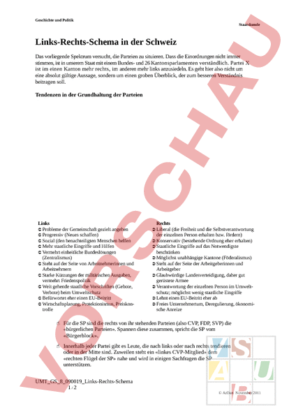 Geschichte und Politik Staatskunde Links-Rechts-Schema in der Schweiz Das vorliegende Spektrum versucht, die Parteien zu situieren. Dass die Einordnungen nicht immer stimmen, ist in unserem Staat mit einem Bundes- und 26 Kantonsparlamenten verständlich. Partei ist im einen Kanton mehr rechts, im anderen mehr links anzusiedeln. Es geht hier also nicht um eine absolut gültige Aussage, sondern um einen groben Überblick, der zum besseren Verständnis beitragen soll. Tendenzen in der Grundhaltung der Parteien Links Probleme der Gemeinschaft gezielt angehen Progressiv (Neues schaffen) Sozial (den benachteiligten Menschen helfen Mehr staatliche Eingriffe und Hilfen Vermehrt einheitliche Bundeslösungen (Zentralismus) Steht auf der Seite von Arbeitnehmerinnen und Arbeitnehmern Starke Kürzungen der militärischen Ausgaben, vermehrt Friedenspolitik Weit gehende staatliche Vorschriften (Gebote, Verbote) beim Umweltschutz Befürwortet eher einen EU-Beitritt Wirtschaftsplanung, Protektionismus, Preiskontrolle Rechts Liberal (die Freiheit und die Selbstverantwortung der einzelnen Person erhalten bzw. fördern) Konservativ (bestehende Ordnung eher erhalten) Staatliche Eingriffe auf das Notwendigste beschränken Möglichst unabhängige Kantone (Föderalismus) Steht auf der Seite der Arbeitgeberinnen und Arbeitgeber Glaubwürdige Landesverteidigung, daher gut gerüstete Armee Verantwortung der einzelnen Person im Umweltschutz; möglichst wenig staatliche Eingriffe Lehnt einen EU-Beitritt eher ab Freies Unternehmertum, Deregulierung, ökonomische Anreize Für die SP sind die rechts von ihr stehenden Parteien (also CVP, FDP, SVP) die «bürgerlichen Parteien». Spannen diese zusammen, spricht die SP vom «Bürgerblock». Innerhalb jeder Partei gibt es Leute, die nach links oder nach rechts tendieren oder in der Mitte sind. Zuweilen steht ein «linkes CVP-Mitglied» dem «rechten Flügel der SP» nahe und wird in einigen Sachfragen die SP unterstützen. UMT_GS_8_090019_Links-Rechts-Schema 1/2 ArDan November 2011 Geschichte und Politik Staatskunde Links-Rechts-Schema in der Schweiz Das vorliegende Spektrum versucht, die Parteien zu situieren. Dass die Einordnungen nicht immer stimmen, ist in unserem Staat mit einem Bundes- und 26 Kantonsparlamenten verständlich. Partei ist im einen Kanton mehr rechts, im anderen mehr links anzusiedeln. Es geht hier also nicht um eine absolut gültige Aussage, sondern um einen groben Überblick, der zum besseren Verständnis beitragen soll. Tendenzen in der Grundhaltung der Parteien Links Probleme der Gemeinschaft gezielt angehen Progressiv (Neues schaffen) Sozial (den benachteiligten Menschen helfen Mehr staatliche Eingriffe und Hilfen Vermehrt einheitliche Bundeslösungen (Zentralismus) Steht auf der Seite von Arbeitnehmerinnen und Arbeitnehmern Starke Kürzungen der militärischen Ausgaben, vermehrt Friedenspolitik Weit gehende staatliche Vorschriften (Gebote, Verbote) beim Umweltschutz Befürwortet eher einen EU-Beitritt Wirtschaftsplanung, Protektionismus, Preiskontrolle Rechts Liberal (die Freiheit und die Selbstverantwortung der einzelnen Person erhalten bzw. fördern) Konservativ (bestehende Ordnung eher erhalten) Staatliche Eingriffe auf das Notwendigste beschränken Möglichst unabhängige Kantone (Föderalismus) Steht auf der Seite der Arbeitgeberinnen und Arbeitgeber Glaubwürdige Landesverteidigung, daher gut gerüstete Armee Verantwortung der einzelnen Person im Umweltschutz; möglichst wenig staatliche Eingriffe Lehnt einen EU-Beitritt eher ab Freies Unternehmertum, Deregulierung, ökonomische Anreize Für die SP sind die rechts von ihr stehenden Parteien (also CVP, FDP, SVP) die «bürgerlichen Parteien». Spannen diese zusammen, spricht die SP vom «Bürgerblock». Innerhalb jeder Partei gibt es Leute, die nach links oder nach rechts tendieren oder in der Mitte sind. Zuweilen steht ein «linkes CVP-Mitglied» dem «rechten Flügel der SP» nahe und wird in einigen Sachfragen die SP unterstützen. UMT_GS_8_090019_Links-Rechts-Schema 2/2 ArDan November 2011