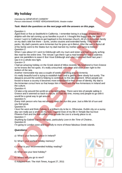 My holiday Interview by GENEVIEVE CARBERY Person interviewed: NYREE YERGAINHARSIAN, theatre-maker Task: Match the questions on the next page with the answers on this page. Question 1: Aged three or five at SeaWorld in California. remember being in buggy shaped like dolphin with the tail coming up as handles to push it. thought this buggy was the bees knees! went to California to get baptised in the Armenian church. All of my Armenian family on my dads side live there – aunts, uncles cousins and extended family. They travel in packs. My dads parents were Armenian but he grew up in Beirut. After the war in Beirut all of his family went to the States but my dad married my mother and came to Ireland. Question 2: When was about 10 went to Edinburgh with my mum and sister and had cavity aching like mad for the entire time. The minute got there got mad toothache until waitress gave me painkillers to ease it! But love Edinburgh and when returned there last year saw it in whole new light. Question 3: had an amazing holiday on the Greek island of Milos recently. My boyfriend is from Greece so he knows the hot spots. Its really untouched; with clean and clear water right to the bottom of the sea. Another memorable trip was couple of weeks travelling around Armenia. Its really beautiful and is trying to establish itself and is getting there slowly but surely. The diaspora around the world is helping to contribute to this development. When people are forced to leave country it becomes more embedded in their sense of identity. My dad is the Armenian consul here so that keeps him in touch with the few Armenians in Ireland and the culture. Question 4: Id take trip around the world on big sailing boat. There were lots of people sailing in Greece and it seemed so back-to-nature. If had the time, money and people to go with it would be great way to get around. Question 5: Every Irish person who has not already seen the sun this year. Just little bit of sun and you feel great. Question 6: love the west and think Galway is brilliant city to be in. Otherwise, Dublin city on sunny day can really put smile on my face. spend most of my life in Temple Bar but love Phoenix Park and the little coffee shop outside the zoo is lovely place to sit. Question 7: Anything by Gabriel García Márquez, particularly Love in the Time of Cholera Question 8: Im going to London soon and hopefully to more of those fabulous Greek islands. Questions: a) Whats your favourite place in Ireland? b) Whats your earliest holiday memory? c) What is your recommended holiday reading? d) What was your best holiday? e) Where will you go to next? Adapted from: The Irish Times, August 27, 2011 f) If budget or work were no restriction, what would be your dream holiday? g) What was your worst holiday? h) Who would you bring on holiday with you if you had your pick? Answer the following questions to the interview My Holiday. Mark the paragraph where you found your answers. 1. Where is Nyrees father originally from? 2. What is his job? 3. Who did Nyree go to Greece with and where did she spend her time there? 4. What does she like to read? 5. Why and at what age did she go to California? 6. What does she say about the sun? 7. What was her problem when she was in Edinburgh? 8. Is Nyree interested in sailing? 9. What does she think of the Greek islands? 10. Which places mentioned in the interview would you like to visit? Why would you like to go there? Adapted from: The Irish Times, August 27, 2011