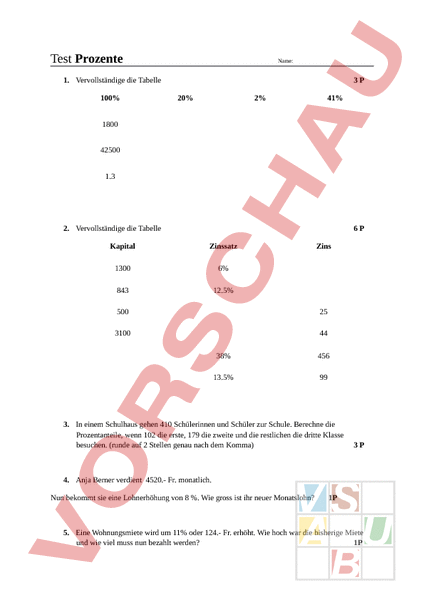 Test Prozente Name: 1. Vervollständige die Tabelle 100% 3P 20% 2% 41% 1800 42500 1.3 2. Vervollständige die Tabelle 6P Kapital Zinssatz 1300 6% 843 12.5% Zins 500 25 3100 44 38% 456 13.5% 99 3. In einem Schulhaus gehen 410 Schülerinnen und Schüler zur Schule. Berechne die Prozentanteile, wenn 102 die erste, 179 die zweite und die restlichen die dritte Klasse besuchen. (runde auf 2 Stellen genau nach dem Komma) 3P 4. Anja Berner verdient 4520.- Fr. monatlich. Nun bekommt sie eine Lohnerhöhung von 8 %. Wie gross ist ihr neuer Monatslohn? 1P 5. Eine Wohnungsmiete wird um 11% oder 124.- Fr. erhöht. Wie hoch war die bisherige Miete und wie viel muss nun bezahlt werden? 1P 6. Lehrling Paul verdient 773 Fr. Monat. Sein Budget sieht so aus Kostgeld 10 Ferien 25 Kleider 20 Bus 8 Schule 15 Taschengeld 12 Berechne wie viel Geld er für jeden Posten zur Verfügung hat. Punkt 17 Note 15.5 6 14 5.5 12.5 5 11 4.5 9.5 4 8 3.5 6.5 3 5 2.5 3.5 2 2 1.5 0 1 6 3P