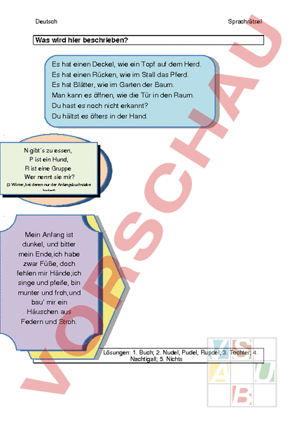 Deutsch Sprachrätsel Was wird hier beschrieben? Es hat einen Deckel, wie ein Topf auf dem Herd. Es hat einen Rücken, wie im Stall das Pferd. Es hat Blätter, wie im Garten der Baum. Man kann es öffnen, wie die Tür in den Raum. Du hast es noch nicht erkannt? Du hältst es öfters in der Hand. gibts zu essen, Wer ist eines Vaters ist ein Hund, ist eine Gruppe Kind keines Wer und nenntdoch sie mir? Kind, einer Mutter (3 Wörter, bei denen nur der Anfangsbuchstabe ändert) Menschen Sohn? Mein Anfang ist dunkel, Werund es bitter wagt, hat meinkeinen Ende,ich Mut.habe Wem es zwar Füße, doch fehlt, dem geht es gut. fehlen Wer mir Hände;ich besitzt, ist singe bettelarm. und pfeife,Wem bin munter und froh,und gelingt, der ist voll bau mir eines gibt, ist Harm. Wer Häuschen aus Wer es hart wie Stein. Federn Stroh.allein. liebt, und der bleibt Lösungen: 1. Buch; 2. Nudel, Pudel, Rupdel; 3. Tochter; 4. Nachtigall; 5. Nichts