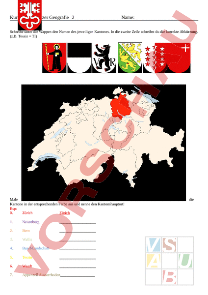 Kurztest Schweizer Geografie 2 Name: Schreibe unter die Wappen den Namen des jeweiligen Kantones. In die zweite Zeile schreibst du die korrekte Abkürzung. (z.B. Tessin TI) Male Kantone in der entsprechenden Farbe aus und nenne den Kantonshauptort! Bsp: 0. Zürich Zürich 1. Neuenburg 2. Bern 3. Wallis 4. Basel-Landschaft 5. Tessin 6. Waadt 7. Appenzell Ausserrhoden die 8. Graubünden 9. Obwalden 10. Fribourg