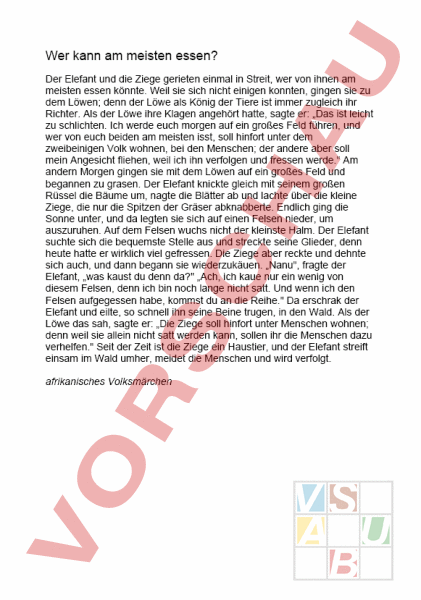 Wer kann am meisten essen? Der Elefant und die Ziege gerieten einmal in Streit, wer von ihnen am meisten essen könnte. Weil sie sich nicht einigen konnten, gingen sie zu dem Löwen; denn der Löwe als König der Tiere ist immer zugleich ihr Richter. Als der Löwe ihre Klagen angehört hatte, sagte er: „Das ist leicht zu schlichten. Ich werde euch morgen auf ein großes Feld führen, und wer von euch beiden am meisten isst, soll hinfort unter dem zweibeinigen Volk wohnen, bei den Menschen; der andere aber soll mein Angesicht fliehen, weil ich ihn verfolgen und fressen werde. Am andern Morgen gingen sie mit dem Löwen auf ein großes Feld und begannen zu grasen. Der Elefant knickte gleich mit seinem großen Rüssel die Bäume um, nagte die Blätter ab und lachte über die kleine Ziege, die nur die Spitzen der Gräser abknabberte. Endlich ging die Sonne unter, und da legten sie sich auf einen Felsen nieder, um auszuruhen. Auf dem Felsen wuchs nicht der kleinste Halm. Der Elefant suchte sich die bequemste Stelle aus und streckte seine Glieder, denn heute hatte er wirklich viel gefressen. Die Ziege aber reckte und dehnte sich auch, und dann begann sie wiederzukäuen. „Nanu, fragte der Elefant, „was kaust du denn da? „Ach, ich kaue nur ein wenig von diesem Felsen, denn ich bin noch lange nicht satt. Und wenn ich den Felsen aufgegessen habe, kommst du an die Reihe. Da erschrak der Elefant und eilte, so schnell ihn seine Beine trugen, in den Wald. Als der Löwe das sah, sagte er: „Die Ziege soll hinfort unter Menschen wohnen; denn weil sie allein nicht satt werden kann, sollen ihr die Menschen dazu verhelfen. Seit der Zeit ist die Ziege ein Haustier, und der Elefant streift einsam im Wald umher, meidet die Menschen und wird verfolgt. afrikanisches Volksmärchen Wer kann am meisten essen? Wahr oder falsch? • Der Elefant und der Löwe gerieten in einen Streit • Der Löwe drohte dem Verlierer eine Strafe an • Der Elefant lachte über die Ziege • Die Ziege hatte am Abend immer noch nicht genug gegessen • Die Ziege knabberte schliesslich noch den Felsen an • Die Ziege erschrak den Elefant • Der Löwe wusste nicht, wen er als Sieger bezeichnen sollte • Der Elefant gewann die Wette • Die Ziege hatte den Elefant reingelegt • Durch diese Wette wurde die Ziege zum Haustier • Die Menschen sollten der Ziege zeigen, wie man weniger isst Wer kann am meisten essen? Ordne die Textstellen in der richtigen Reihenfolge! • Endlich ging die Sonne unter, und da legten sie sich auf einen Felsen nieder, um auszuruhen • Seit der Zeit ist die Ziege ein Haustier • Die Ziege aber reckte und dehnte sich auch, und dann bekann sie wiederzukäuen • Weil sie sich nicht einigen konnten, gingen sie zu dem Löwen • Da erschrak der Elefant und eilte in den Wald • Der Elefant knickte gleich mit seinem grossen Rüssel die Bäume um • Am anderen Morgen gingen sie mit dem Löwen auf ein grosses Feld und begannen zu grasen Wer kann am meisten essen? Fragen zum Text Aus welchem Grund holten die beiden Tiere en Löwen zu Rat? Warum lachte der Elefant während der Wette über die Ziege? Wie gelang es der Ziege, die Wette zu gewinnen? Wie reagierte der Elefant auf die Drohungen der Ziege? Was waren die Konsequenzen dieser Wette für die beiden Tiere? Warum sollte die Ziege bei den Menschen wohnen? Was haltest du von der Wette? Warum? Wer kann am meisten essen? Lückentext Der Elefant und die Ziege gerieten einmal in, wer von ihnen am meisten könnte. Weil sie sich nicht konnten, gingen sie zu dem Löwen; denn der Löwe als der Tiere ist immer zugleich ihr. Als der Löwe ihre angehört hatte, sagte er: „Das ist leicht zu. Ich werde euch morgen auf ein großes führen, und wer von euch beiden am meisten isst, soll hinfort unter demVolk wohnen, bei den Menschen; der andere aber soll mein Angesicht, weil ich ihn und fressen werde. Am andern Morgen gingen sie mit dem auf ein großes Feld und begannen zu. Der Elefant knickte gleich mit seinem großen Rüssel die um, nagte die Blätter ab und über die kleine Ziege, die nur dieder Gräser abknabberte. Endlich ging dieunter, und da legten sie sich auf einennieder, um auszuruhen. Auf dem Felsennicht der kleinste Halm. Der Elefant suchte sich dieStelle aus und streckte seine, denn heute hatte er wirklich viel gefressen. Die Ziege aber reckte und dehnte sich auch, und dann begann sie. „Nanu, fragte der Elefant, „was du denn da? „Ach, ich kaue nur ein wenig von diesem, denn ich bin noch lange nicht. Und wenn ich den Felsen aufgegessen habe, kommst du an die. Da der Elefant und eilte, so schnell ihn seinetrugen, in den. Als der Löwe das sah, sagte er: „Die Ziege soll hinfort unter Menschen wohnen; denn weil sie allein nicht werden kann, sollen ihr die Menschen dazu. Seit der Zeit ist die Ziege ein, und der Elefant einsam im Wald umher, meidet die Menschen und wird.Volksmärchen