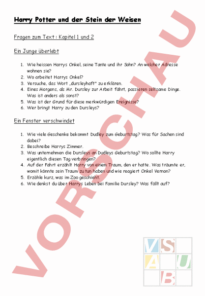 Arbeitsblatt: Harry Potter und der Stein der Weisen