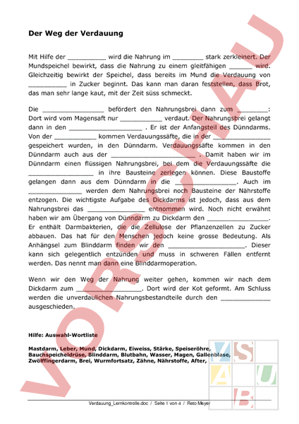 Der Weg der Verdauung Mit Hilfe der wird die Nahrung im stark zerkleinert. Der Mundspeichel bewirkt, dass die Nahrung zu einem gleitfähigen wird. Gleichzeitig bewirkt der Speichel, dass bereits im Mund die Verdauung von in Zucker beginnt. Das kann man daran feststellen, dass Brot, das man sehr lange kaut, mit der Zeit süss schmeckt. Die befördert den Nahrungsbrei dann zum : Dort wird vom Magensaft nur verdaut. Der Nahrungsbrei gelangt dann in den Er ist der Anfangsteil des Dünndarms. Von der kommen Verdauungssäfte, die in der gespeichert wurden, in den Dünndarm. Verdauungssäfte kommen in den Dünndarm auch aus der Damit haben wir im Dünndarm einen flüssigen Nahrungsbrei, bei dem die Verdauungssäfte die in ihre Bausteine zerlegen können. Diese Baustoffe gelangen dann aus dem Dünndarm in die . Auch im werden dem Nahrungsbrei noch Bausteine der Nährstoffe entzogen. Die wichtigste Aufgabe des Dickdarms ist jedoch, dass aus dem Nahrungsbrei das entnommen wird. Noch nicht erwähnt haben wir am Übergang von Dünndarm zu Dickdarm den . Er enthält Darmbakterien, die die Zellulose der Pflanzenzellen zu Zucker abbauen. Das hat für den Menschen jedoch keine grosse Bedeutung. Als Anhängsel zum Blinddarm finden wir den . Dieser kann sich gelegentlich entzünden und muss in schweren Fällen entfernt werden. Das nennt man dann eine Blinddarmoperation. Wenn wir den Weg der Nahrung weiter gehen, kommen wir nach dem Dickdarm zum. Dort wird der Kot geformt. Am Schluss werden die unverdaulichen Nahrungsbestandteile durch den ausgeschieden. Hilfe: Auswahl-Wortliste Mastdarm, Leber, Mund, Dickdarm, Eiweiss, Stärke, Speiseröhre, Bauchspeicheldrüse, Blinddarm, Blutbahn, Wasser, Magen, Gallenblase, Zwölffingerdarm, Brei, Wurmfortsatz, Zähne, Nährstoffe, After, Verdauung_Lernkontrolle.doc Seite 1 von 4 Reto Meyer Fragen: Wo findet die Vorverdauung der Kohlenhydrate statt? Welches Enzym ist im Magen vorhanden? Was wird im Magen vorverdaut? Wofür ist die Magenschleimhaut? Was geschieht im Dünndarm? Wo werden die Fette verdaut? Was ist ein Enzym? Sind die Enzyme für den Menschen lebensnotwendig? Welches Organ produziert Galle? Wofür dient die Galle? Wie lang ist der Dünndarm etwa? Was ist Stärke? Malzzucker Mehrfachzucker Eine Person, die sehr stark ist Eiweisse Wo findet die mechanische Zerkleinerung der Nahrung statt? im Magen im Zwölffingerdarm im Mund in der Leber Verdauung_Lernkontrolle.doc Seite 2 von 4 Reto Meyer Der Weg der Verdauung (Lösung) Mit Hilfe der Zähne wird die Nahrung im Mund stark zerkleinert. Der Mundspeichel bewirkt, dass die Nahrung zu einem gleitfähigen Brei wird. Gleichzeitig bewirkt der Speichel, dass bereits im Mund die Verdauung von Stärke in Zucker beginnt. Das kann man daran feststellen, dass Brot, das man sehr lange kaut, mit der Zeit süss schmeckt. Die Speiseröhre befördert den Nahrungsbrei dann zum Magen. Dort wird vom Magensaft nur Eiweiss verdaut. Der Nahrungsbrei gelangt dann in den Zwölffingerdarm. Er ist der Anfangsteil des Dünndarms. Von der Leber kommen Verdauungssäfte, die in der Gallenblase gespeichert wurden, in den Dünndarm. Verdauungssäfte kommen in den Dünndarm auch aus der Bauchspeicheldrüse. Damit haben wir im Dünndarm einen flüssigen Nahrungsbrei, bei dem die Verdauungssäfte die Nährstoffe in ihre Bausteine zerlegen können. Diese Baustoffe gelangen dann aus dem Dünndarm in die Blutbahn. Auch im Dickdarm werden dem Nahrungsbrei noch Bausteine der Nährstoffe entzogen. Die wichtigste Aufgabe des Dickdarms ist jedoch, dass aus dem Nahrungsbrei das Wasser entnommen wird. Noch nicht erwähnt haben wir am Übergang von Dünndarm zu Dickdarm den Blinddarm. Er enthält Darmbakterien, die die Zellulose der Pflanzenzellen zu Zucker abbauen. Das hat für den Menschen jedoch keine grosse Bedeutung. Als Anhängsel zum Blinddarm finden wir den Wurmfortsatz. Dieser kann sich gelegentlich entzünden und muss in schweren Fällen entfernt werden. Das nennt man dann eine Blinddarmoperation. Wenn wir den Weg der Nahrung weiter gehen, kommen wir nach dem Dickdarm zum Mastdarm. Dort wird der Kot geformt. Am Schluss werden die unverdaulichen Nahrungsbestandteile durch den After ausgeschieden. Verdauung_Lernkontrolle.doc Seite 3 von 4 Reto Meyer Übersicht über die Verdauung Organe Abbildungen Kohlenhydrate Fette Proteine Mund Vorverdauung durch die Amylase Ptyalin, Kohlenhydrate werden bis zu Maltose abgebaut ------------- ------------ Speiseröhre (Vorverdauung geht weiter) ------------- ------------ Magen Magensäure inaktiviert die Amylase und stoppt die Vorverdauung ------------- Dünndarm Verdauung durch Amylasen aus den Verdauungssäften der Bauchspeicheldrüse und der Gallenblase, Aufnahme der Monosaccharide in die Darmwand und Weiterleitung in die Blutbahn Verdauung durch Lipasen aus den Verdauungssäften der Bauchspeicheldrüse und der Gallenblase, Aufnahme der Fettsäuren und des Glycerins in die Darmwand und Weiterleitung in die Blutbahn Verdauung durch Peptidasen aus den Verdauungssäften der Bauchspeicheldrüse und der Gallenblase, Aufnahme der Aminosäuren in die Darmwand und Weiterleitung in die Blutbahn Dickdarm Weiter Aufnahme der Monosaccharide in die Darmwand und Weiterleitung in die Blutbahn, Rückgewinnung des Wassers Weiter Aufnahme der Fettsäuren und des Glycerins in die Darmwand und Weiterleitung in die Blutbahn, Rückgewinnung des Wassers Weiter Aufnahme der Aminosäuren in die Darmwand und Weiterleitung in die Blutbahn, Rückgewinnung des Wassers Verdauung_Lernkontrolle.doc Seite 4 von 4 Reto Meyer Vorverdauung durch das Enzym Pepsin