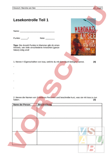 Deutsch: Marokko am See ph_siegel Lesekontrolle Teil 1 Name: Punkte: / Note: Tipp: Die Anzahl Punkte in Klammer gibt dir einen Hinweis, wie viele verschiedene Antworten (ganze Sätze) nötig sind! 1. Nenne 4 Eigenschaften von Issa, welche du mit dem Buch belegen kannst. (4) 2. Nenne die Namen von 3 weiteren Personen und beschreibe kurz, was sie mit Issa zu tun haben. (3) Name der Person Beschreibung Deutsch: Marokko am See ph_siegel 3. An Issas aktueller Schule wird im Turnen nur Kampfsport unterrichtet! Warum? Gib 2 Gründe an. (2) 4. Was macht Issa jeweils, wenn er bei seinem Nachbarn zu Besuch ist? (1) 5. Issa ging früher an die Koranschule. Was hat er dort gelernt und warum besucht er diese Schule nicht mehr? (3) 6. Mit welchem Freund stellt Issa in seiner Freizeit Unfug an? Was machen sie jeweils und vor wem haben sie Angst? (3) 7. Beurteile die folgenden Aussagen zur Geschichte. Kreuze an, ob sie Richtig oder Falsch sind. (4) Richtig Falsch a. b. c. d. e. f. g. h. Issa mag den Propheten Ibrahim nicht, weil dieser seinen Sohn schlachten wollte. Der Werklehrer baut gerne Sandskulpturen. Issas grosser Bruder wohnt bei seiner Freundin. Issa wurde am Sonntag von Farahs Eltern zum Nachtessen eingeladen. Die Schüler dürfen jeweils am Wochenende ein Schwein nach Hause nehmen. Issas Grossmutter sprach Arabisch, Marokkanisch, Englisch und die Sprache der Berber. Der Vater verbrachte die Festtage meist in der Moschee, damit er das traurige Gesicht der Mutter nicht sehen musste. Die Mutter eines Schülers wollte mit dem Sportlehrer sprechen, weil dieser den Schüler zwingt, neue Turnschuhe zu kaufen.