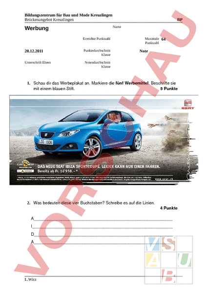 Bildungszentrum für Bau und Mode Kreuzlingen Brückenangebot Kreuzlingen Name Werbung Erreichte Punktzahl 20.12.2011 Unterschrift Eltern BP Punktedurchschnitt Klasse Maximale Punktzahl 64 Note Notendurchschnitt Klasse 1. Schau dir das Werbeplakat an. Markiere die fünf Werbemittel. Beschrifte sie mit einem blauen Stift. 5 Punkte 2. Was bedeuten diese vier Buchstaben? Schreibe es auf die Linien. 4 Punkte A I_ D A L.Wirz Bildungszentrum für Bau und Mode Kreuzlingen Brückenangebot Kreuzlingen BP 3. Analysiere das Plakat anhand des AIDAPrinzips. Welches Werbemittel (aus Aufgabe 1) gehört zu welchem Buchstaben? Suche ein Beispiel vom Plakat. 8 Punkte Mittel der Werbung Beispiel vom Plakat Beispiel: Bild 4. Zielgruppe Welches ist die Zielgruppe dieser Plakate? Schreibe die Zielgruppe hin und begründe deine Wahl in 3 Sätzen. 2x4 Punkte Zielgruppe: L.Wirz Bildungszentrum für Bau und Mode Kreuzlingen Brückenangebot Kreuzlingen BP Begründung:_ Zielgruppe: Begründung:_ 5. Merkmale von Slogans 7 Punkte Um den Kunden von einem Produkt zu überzeugen, wird durch den Slogan eine Beziehung zwischen dem Kunden und dem Produkt hergestellt. Es gibt verschiedene Möglichkeiten, dies zu tun: Der Slogan erfüllt Wunschvorstellungen des Kunden. 1 „Lebe deine Träume! (Auto) L.Wirz Bildungszentrum für Bau und Mode Kreuzlingen Brückenangebot Kreuzlingen BP Er wertet den Kunden auf. 2 „Bezahlen Sie einfach mit Ihrem guten Namen. (Kreditkarte) Er verspricht dem Kunden etwas. 3 „Da werden Sie geholfen. (Telefonauskunft) Er verspricht dem Kunden Sicherheit. 4 „Sicherheit für ein cholesterinbewusstes Leben. (Becel) Er reizt erotisch. 5 „Unwiderstehlich sinnlich! (Moschus) Er betont den Preis. 6 „Preise gut, alles gut! (C&A) Er betont Qualität. 7 „Persil bleibt Persil. – „Nimm Wrigley Spearmint nimm Qualität. Zu welchem Merkmal passen die folgenden Slogans? „Alles wird besser – Valser bleibt gut! Nr. „Hoffentlich Allianz versichert! Nr. „Ja, der Kunde ist König bei Edeka! Nr. „Stoppt den Schmerz, beschleunigt die Heilung. Nr. „Geiz ist geil! Nr. „Einfach unwiderstehlich! Nr. „Natürlich schlank werden. Nr. 6. Ordne den folgenden Bildern den 4 Ps zu und notiere mögliche Produkte, für die geworben werden könnte. L.Wirz 4 Punkte Bildungszentrum für Bau und Mode Kreuzlingen Brückenangebot Kreuzlingen BP 7. Schau dir die beiden Werbebilder an. Achte auch darauf wann diese beiden Werbeplakate erschienen sind. Was denkst du, wie ist die Werbeindustrie hier vorgegangen? Was ist das Ziel? 5 Punkte Abbildung Werbung erschienen März 2010 L.Wirz Bildungszentrum für Bau und Mode Kreuzlingen Brückenangebot Kreuzlingen BP Abbildung Werbung erschienen April 2010 Kreuzworträtsel zur Geschichte der Werbung. L.Wirz 8 Punkte Bildungszentrum für Bau und Mode Kreuzlingen Brückenangebot Kreuzlingen Waagrecht 1. Blickwinkel, Blickrichtung, Betrachtungsweise 3. Eingebung, Einflüsterung 5. Abweichung vom Normalen 6. Gewinn 7. herausfordernd 8. grafisch dargestelltes Wortzeichen einer Firma Senkrecht 2. verbrauchen, Verbrauchsgüter 3. Leitspruch 4. Herausgeber, früher Geldauslagen 8. Buchstaben, Schrift L.Wirz BP Bildungszentrum für Bau und Mode Kreuzlingen Brückenangebot Kreuzlingen BP 8. Werbespot Coca Cola. Welche 3er Regel findest du darin? Oder vielleicht sogar eine 6er/ 9er? L.Wirz 9 Punkte Bildungszentrum für Bau und Mode Kreuzlingen Brückenangebot Kreuzlingen 9. Analysiere den Werbespot nach den 3 WFragen. BP 6 Punkte 1. Frage: Frage: Frage: L.Wirz