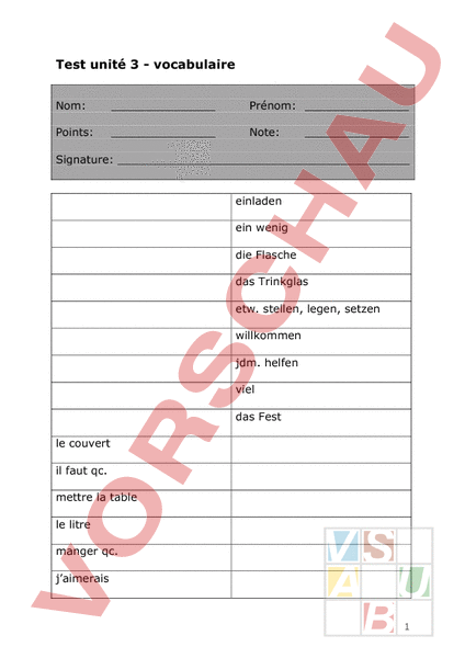 Test unité 3 vocabulaire Nom: Prénom: Points: Note: Signature: einladen ein wenig die Flasche das Trinkglas etw. stellen, legen, setzen willkommen jdm. helfen viel das Fest le couvert il faut qc. mettre la table le litre manger qc. jaimerais 1 Zeichne die Gegenstände in das passende Feld. 1. En 2. Au 3. En 4. Au 5. En 6. Au 7. En 8. En 9. En haut à gauche il a un verre. milieu il a une assiette. bas à droite il a un couteau. milieu à gauche il a une serviette bleue. haut à droite il a le sel. milieu à droite il a le poivre. bas au milieu il a une cuillère. haut au milieu il aune fourchette. bas à gauche il a le pain. Bonne Chance! 2