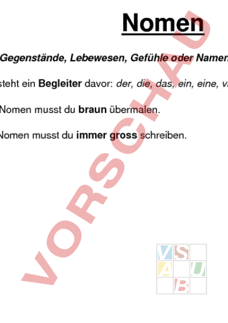 Nomen alle Gegenstände, Lebewesen, Gefühle oder Namen Oft steht ein Begleiter davor: der, die, das, ein, eine, viele, einige, usw. Die Nomen musst du braun übermalen. Du Nomen musst du immer gross schreiben. Verben Sie beschreiben eine Tätigkeit, etwas dass man machen kann. Die Verben musst du blau übermalen. Die Verben schreibst du klein. Die Verben kannst du konjugieren: ich gehe du gehst er, sie, es geht wir gehen ihr geht sie gehen Jedes Verb hat einen Infinitiv (Grundform): singen, lachen, fragen, rufen, hüpfen, sehen, rennen, usw. Du kannst das Verb in verschiedene Zeitformen setzen: Präsens: ich gehe Präteritum: ich ging Perfekt: ich bin gegangen Plusquamperfekt: ich war gegangen Futur: ich werde gehen Adjektive Sie beschreiben wie etwas ist, oder wie etwas getan wird. Der Baum ist gross. Die Katze rennt schnell. Sie gleichen sich dem Nomen an: Das tolle Spiel. Am frühen Morgen Du musst sie gelb übermalen. Du schreibst die Adjektive klein. Du kannst sie steigern: gross grösser am grössten Pronomen Die Pronomen können anstatt einem Nomen stehen: Der Mann er, das Haus es, die Frau sie Die Pronomen können ein Nomen begleiten: Ein Hund, einige Kinder, das Loch, mein Fahrrad, usw. Fragewörter sind auch Pronomen: Wer?, wo?, wann?, wieso?, usw. Von den Verben kennst du die Personalpronomen: ich, du, er, sie, es, wir, ihr, sie (alle) Du musst sie mit orange übermalen. Du schreibst die Pronomen klein. Du kannst die Pronomen verändern: Mein Hund ist schwarz. Das Halsband meines Hundes ist rot. Ich gehe mit meinem Hund spazieren. Ich rufe meinen Hund Es gibt Partikelpronomen! (PartikelPronomen) ins in das, ans an das, aufs auf das, ums um das, beim bei dem, am an dem, zum zu dem, im in dem, zur zu der Partikel Partikel sind unveränderlich. Sie sind jene Wörter, die keine Nomen, Verben, Adjektive oder Pronomen sind. denn, aber, manchmal, nie, weil, aber, dass, wenn, so, nie, und, oder. Du musst sie grün übermalen. Du schreibst sie klein.