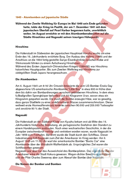 1945 Atombomben auf japanische Städte Während der Zweite Weltkrieg für Europa im Mai 1945 sein Ende gefunden hatte, tobte der Krieg im Pazifik, der am 7. Dezember 1941 mit dem japanischen Überfall auf Pearl Harbor begonnen hatte, unerbittlich weiter. Im August erreichte er mit den Atombombenabwürfen auf die Städte Hiroshima und Nagasaki seinen traurigen Höhepunkt. Hiroshima Die Hafenstadt im Südwesten der japanischen Hauptinsel Honshu wuchs um eine Ende des 16. Jahrhunderts errichtete Burg. Der Ausbau des Hafens (1889) und der Anschluss an die 1894 fertig gestellte SanyoEisenbahnlinie zwischen Kobe und Shimonoseki führten zu einem Aufschwung Hiroshimas. Während des Ersten JapanischChinesischen Krieges (1894/95) war Hiroshima kaiserliches Hauptquartier. Bis zum Zweiten Weltkrieg war Hiroshima zur siebtgrößten Stadt Japans herangewachsen. Die Atombomben Am 6. August 1945 um 8:16 Uhr Ortszeit detonierte die vom USBomber Enola Gay abgeworfene USamerikanische Atombombe Little Boy in etwa 600 Höhe über dem bis dahin von Bombardierungen verschont gebliebenen Hiroshima. In dem etwa fußballgroßen Sprengkörper befanden sich 60 Kilogramm Uran, wovon etwa ein Kilogramm gespalten wurde. Die durch die Bombe erzeugte Hitze, war so gewaltig, dass ganze Stadtteile zu einer undefinierbaren Masse zusammenschmolzen. Dieser weltweit erste Atomwaffeneinsatz forderte zwischen 90.000 und 200.000 Todesopfer und zerstörte 80 der Stadt. Nagasaki Die Hafenstadt an der SüdwestKüste von Kyushu bekam erst ab Mitte des 16. Jahrhunderts historische Bedeutung, als portugiesische Seefahrer den Standort zu einem Handelsposten ausbauten. Nach einer wechselvollen Geschichte, in der die Europäer zwischendurch verfolgt und vertrieben worden waren, wurde Nagasaki im Jahr 1859 zum Freihafen. Berühmt wurde die Stadt durch den Schiffbau. Dieser Industriezweig ließ Nagasaki zum Ziel der Amerikaner im Krieg werden: Am 9. August 1945 um 11:02 Uhr warf der amerikanische Bomber Bocks Car eine Atombombe über der MitsubishiWaffenfabrik ab. Ursprüngliches Ziel waren die Schiffswerften gewesen. Nagasaki war aber nur das Ausweichziel des Bomberpiloten. Das eigentliche Ziel der Amerikaner wäre die Stadt Kokura gewesen. Wegen dichter Bewölkung entschied sich der Pilot Charles Sweeney aber zum Abwurf der Bombe über Nagasaki. Die Namen der Bomber und Bomben Während die deutschen Städte von den so genannten Fliegenden Festungen (Flying Fortress) angegriffen wurden, hatte die USLuftwaffe als Atombombenträger einen noch größeren Bomber bauen lassen, die Superfestung (Superfortress). Die einzelnen Maschinen eines Typs bekamen ihre Namen von den Piloten, so war die Mutter des Piloten Paul Tibbets Namensgeberin für die Enola Gay. Tibbets hatte seine Maschine nach dem Vornamen der Mutter benannt. Der Bomber Bockscar (oder Bocks Car) ist nach seinem ersten Piloten Frederick C. Bock benannt worden. Auch die Atombomben hatten Namen bekommen. So hieß die HiroshimaBombe Little Boy, was kleiner Junge bedeutet. Die NagasakiBombe war größer und runder und hieß deshalb Fat Man (Dicker Mann). Die Folgen der Atombombe Nach sechzig Jahren wird die Gesamtzahl der Todesopfer in Hiroshima mit über 200.000 angegeben. Die durch die Explosion freigesetzten radioaktiven Strahlen lösten zahlreiche Krankheiten aus, wie zum Beispiel Verbrennungen und Krebs. Auch die Kinder und Enkel der Überlebenden sind von den Folgen der Atombombe betroffen. So werden immer wieder Kinder mit Missbildungen geboren. Viele der Atombombenopfer leiden heute noch unter den Verletzungen und erliegen noch Jahrzehnte später dem schleichenden Strahlentod.