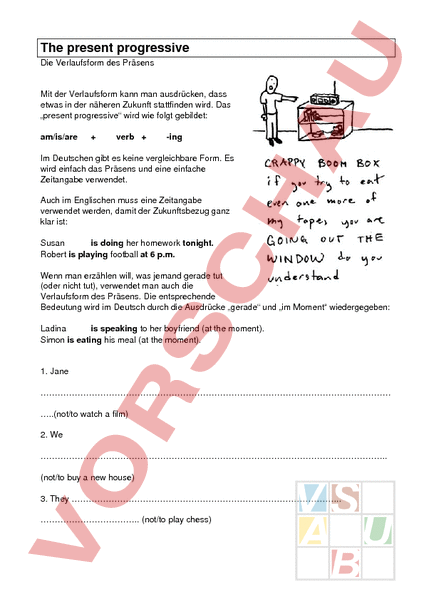 The present progressive Die Verlaufsform des Präsens Mit der Verlaufsform kann man ausdrücken, dass etwas in der näheren Zukunft stattfinden wird. Das „present progressive wird wie folgt gebildet: am/is/are verb ing Im Deutschen gibt es keine vergleichbare Form. Es wird einfach das Präsens und eine einfache Zeitangabe verwendet. Auch im Englischen muss eine Zeitangabe verwendet werden, damit der Zukunftsbezug ganz klar ist: Susan is doing her homework tonight. Robert is playing football at 6 p.m. Wenn man erzählen will, was jemand gerade tut (oder nicht tut), verwendet man auch die Verlaufsform des Präsens. Die entsprechende Bedeutung wird im Deutsch durch die Ausdrücke „gerade und „im Moment wiedergegeben: Ladina is speaking to her boyfriend (at the moment). Simon is eating his meal (at the moment). 1. Jane (not/to watch film) 2. We (not/to buy new house) 3. They (not/to play chess) 4. Peter (not/to feed his dog) 5. Mary (not/to wash her hair) 6. Max and Sue . (not/to help their father) 7. You (not/to learn the poem) 8. Peggy . (not/to draw picture) 9. Phil and Nick (not/to sing song) 10. . (not/to talk to John)