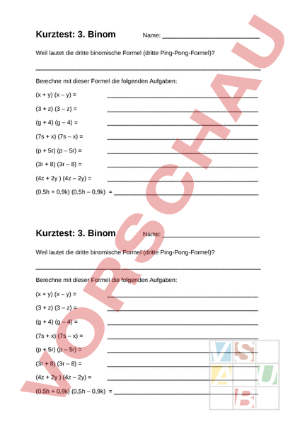 Kurztest: 3. Binom Name: Weil lautet die dritte binomische Formel (dritte Ping-Pong-Formel)? Berechne mit dieser Formel die folgenden Aufgaben: (x y) (x – y) (3 z) (3 – z) (g 4) (g – 4) (7s x) (7s – x) (p 5r) (p – 5r) (3r 8) (3r – 8) (4z 2y (4z – 2y) (0,5h 0,9k) (0,5h – 0,9k) Kurztest: 3. Binom Name: Weil lautet die dritte binomische Formel (dritte Ping-Pong-Formel)? Berechne mit dieser Formel die folgenden Aufgaben: (x y) (x – y) (3 z) (3 – z) (g 4) (g – 4) (7s x) (7s – x) (p 5r) (p – 5r) (3r 8) (3r – 8) (4z 2y (4z – 2y) (0,5h 0,9k) (0,5h – 0,9k)