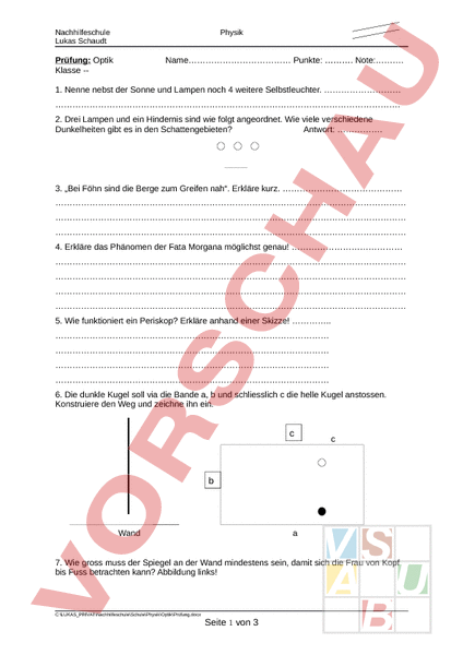 Nachhilfeschule Lukas Schaudt Physik Prüfung: Optik Klasse -- Name Punkte: . Note:. 1. Nenne nebst der Sonne und Lampen noch 4 weitere Selbstleuchter. . 2. Drei Lampen und ein Hindernis sind wie folgt angeordnet. Wie viele verschiedene Dunkelheiten gibt es in den Schattengebieten? Antwort: . 3. „Bei Föhn sind die Berge zum Greifen nah. Erkläre kurz. 4. Erkläre das Phänomen der Fata Morgana möglichst genau! 5. Wie funktioniert ein Periskop? Erkläre anhand einer Skizze! 6. Die dunkle Kugel soll via die Bande a, und schliesslich die helle Kugel anstossen. Konstruiere den Weg und zeichne ihn ein. Wand 7. Wie gross muss der Spiegel an der Wand mindestens sein, damit sich die Frau von Kopf bis Fuss betrachten kann? Abbildung links! C:\LUKAS_PRIVAT\Nachhilfeschule\Schule\Physik\Optik\Prüfung.docx Seite 1 von 3 Nachhilfeschule Lukas Schaudt Physik 8. Wie gross ist ein Lichtjahr? 9. Konstruiere das Bild der Kerze da, wo sie scharf abgebildet wird. 10. In einem Lichtleiter folgt das Licht dem Glasstab oder der Glasfaser und tritt erst am Ende des Stabes ausserhalb des Glases aus. Erkläre a) Wieso das Licht im Leiter bleibt? b) warum es am Ende austreten kann? c) Gib zwei praktische Anwendungen für Lichtleiter an: 11. Konstruiere den Strahlengang der Lichtstrahlen bei den folgenden Holspiegeln. C:\LUKAS_PRIVAT\Nachhilfeschule\Schule\Physik\Optik\Prüfung.docx Seite 2 von 3 Nachhilfeschule Lukas Schaudt Physik 12. Konstruiere die ungefähren Strahlengänge der Lichtstrahlen durch die folgenden Glaskörper. Du kannst annehmen, dass die Lichtgeschwindigkeiten im Glas rund zwei Drittel der Lichtgeschwindigkeiten in der Luft beträgt. C:\LUKAS_PRIVAT\Nachhilfeschule\Schule\Physik\Optik\Prüfung.docx Seite 3 von 3