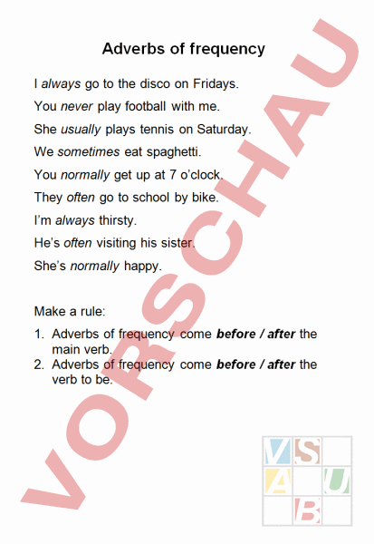 Adverbs of frequency always go to the disco on Fridays. You never play football with me. She usually plays tennis on Saturday. We sometimes eat spaghetti. You normally get up at 7 oclock. They often go to school by bike. Im always thirsty. Hes often visiting his sister. Shes normally happy. Make rule: 1. Adverbs of frequency come before after the main verb. 2. Adverbs of frequency come before after the verb to be. Make sentences: 1. 2. 3. 4. 5. early usually gets up My brother /. football They play often /. always is hungry She /. take John and Sarah the bus sometimes /. Sandra by underground to school usually goes /. 6. We happy always are /. 7. visits My sister often on Saturday our grandmother /. Translate the following sentences: 1. Ich gehe normalerweise am Samstag einkaufen. 2. Er putzt sein Zimmer immer am Mittwoch. 3. Manchmal spielen wir Fussball. 4. Normalerweise esse ich in der Kantine. 5. Sie trinken nie Bier. 6. Sie besucht oft ihre Tante. 7. Du spielst gewöhnlich am Freitag Tennis. 8. Im Sommer bin ich immer draussen.