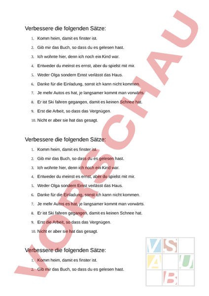 Verbessere die folgenden Sätze: 1. Komm heim, damit es finster ist. 2. Gib mir das Buch, so dass du es gelesen hast. 3. Ich wohnte hier, denn ich noch ein Kind war. 4. Entweder du meinst es ernst, aber du spielst mit mir. 5. Weder Olga sondern Ernst verlässt das Haus. 6. Danke für die Einladung, sonst ich kann nicht kommen. 7. Je mehr Autos es hat, je langsamer kommt man vorwärts. 8. Er ist Ski fahren gegangen, damit es keinen Schnee hat. 9. Erst die Arbeit, so dass das Vergnügen. 10. Nicht er aber sie hat das gesagt. Verbessere die folgenden Sätze: 1. Komm heim, damit es finster ist. 2. Gib mir das Buch, so dass du es gelesen hast. 3. Ich wohnte hier, denn ich noch ein Kind war. 4. Entweder du meinst es ernst, aber du spielst mit mir. 5. Weder Olga sondern Ernst verlässt das Haus. 6. Danke für die Einladung, sonst ich kann nicht kommen. 7. Je mehr Autos es hat, je langsamer kommt man vorwärts. 8. Er ist Ski fahren gegangen, damit es keinen Schnee hat. 9. Erst die Arbeit, so dass das Vergnügen. 10. Nicht er aber sie hat das gesagt. Verbessere die folgenden Sätze: 1. Komm heim, damit es finster ist. 2. Gib mir das Buch, so dass du es gelesen hast. 3. Ich wohnte hier, denn ich noch ein Kind war. 4. Entweder du meinst es ernst, aber du spielst mit mir. 5. Weder Olga sondern Ernst verlässt das Haus. 6. Danke für die Einladung, sonst ich kann nicht kommen. 7. Je mehr Autos es hat, je langsamer kommt man vorwärts. 8. Er ist Ski fahren gegangen, damit es keinen Schnee hat. 9. Erst die Arbeit, so dass das Vergnügen. 10. Nicht er aber sie hat das gesagt.