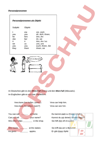 Personalpronomen Personalpronomen als Objekt Subjekt Objekt you he she it we you they me you him her it us you them mir, mich dir, dich; Ihnen, ihm, ihn ihr, sie ihm, ihn es uns, uns euch; Ihnen, Sie ihnen, sie Im Deutschen gibt es den Wem-Fall (Dativ) und den Wen-Fall (Akkusativ). Im Englischen gibt es nur eine Objektform: Vera kann ihm helfen. (wem?) Vera can help him. Vera kann ihn sehen. (wen?) Vera can see him. You can call at home. Du kannst mich zu Hause anrufen. Can you tell your name? Kannst du mir deinen Namen sagen? She often helps in the shop. Sie hilft ihm oft im Laden. She meets at the station. Sie trifft ihn am U-Bahnhof. He gives apples. Er gibt ihnen Äpfel. He puts on the table. Er stellt sie auf den Tisch. He eats all alone. Er isst sie alle alleine auf. Tell that the apples are good. Can you give more apples? Apples are good for Oh, we love too. Sag ihm, dass die Äpfel sind gut. Kannst du uns mehr Äpfel geben? Äpfel sind gut für euch Oh, wir mögen sie auch gern.