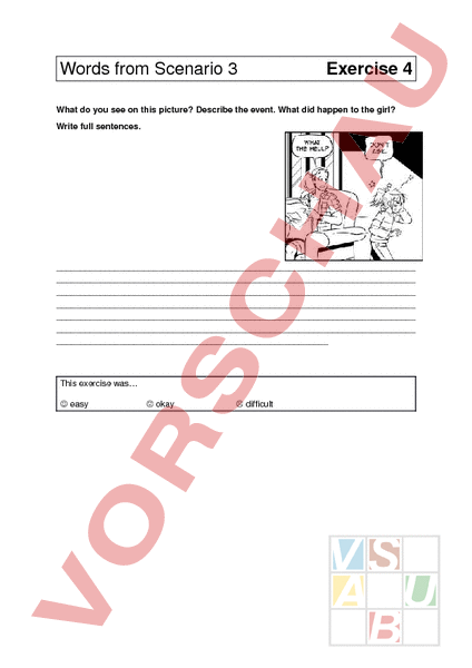 Words from Scenario 3 Exercise 4 What do you see on this picture? Describe the event. What did happen to the girl? Write full sentences. This exercise was easy okay difficult