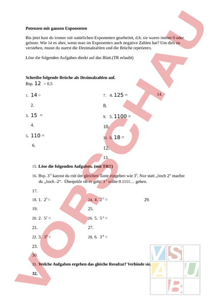 Potenzen mit ganzen Exponenten Bis jetzt hast du immer mit natürlichen Exponenten gearbeitet, d.h. sie waren immer 0 oder grösser. Wie ist es aber, wenn man im Exponenten auch negative Zahlen hat? Um dies zu verstehen, musst du zuerst die Dezimalzahlen und die Brüche repetieren. Löse die folgenden Aufgaben direkt auf das Blatt.(TR erlaubt) Schreibe folgende Brüche als Dezimalzahlen auf. Bsp. 12 0.5 1. 3. 5. 14 7. 4. 125 2. 8. 15 9. 5. 1100 4. 10. 110 11. 6. 18 6. 14. 12. 13. 15. Löse die folgenden Aufgaben. (mit TR!!) 16. Bsp. 3-2 kannst du mit der gleichen Taste eingeben wie 32. Nur statt „hoch 2 machst du „hoch -2. Überprüfe ob es geht. 3-2 sollte 0.1111 geben. 17. 18. 1. 23 24. 4. 2-3 19. 25. 20. 2. 52 26. 5. 5-2 21. 27. 22. 3. 34 28. 6. 3-4 29. 23. 30. 31. Welche Aufgaben ergeben das gleiche Resultat? Verbinde sie. 32. 33. 22 43. 2-2 54. 102 34. 44. 55. 35. 25 45. 125 56. 11000 46. 57. 47. 103 58. 5-2 48. 59. 36. 0.25 37. 38. 122 1103 39. 10-3 49. 40. 50. 61. 51. 14 62. 0.001 41. 42. 0.04 52. 53. 63. 60.